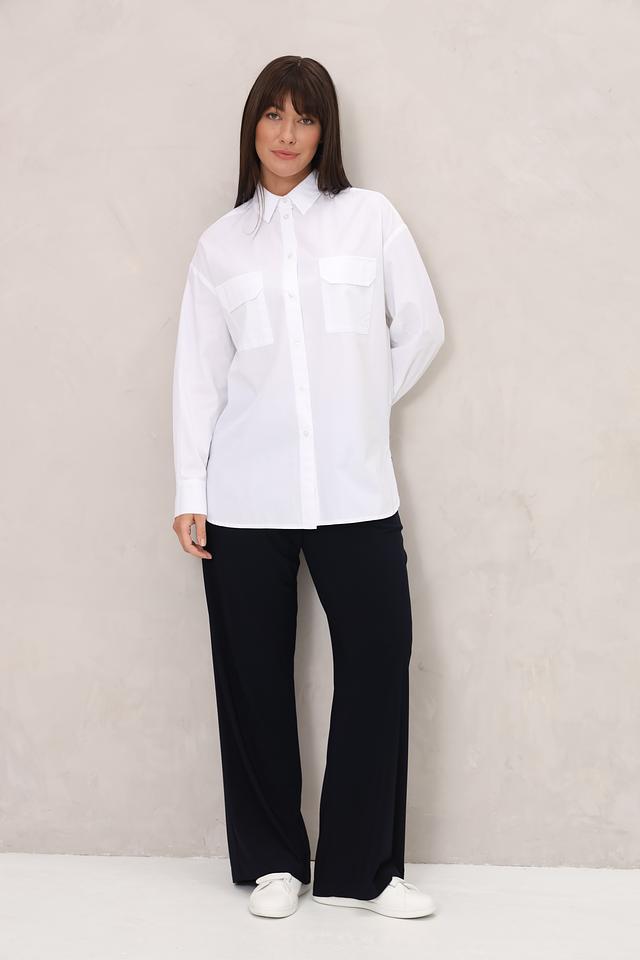 Брюки имеют высокую посадку и эластичный пояс, что обеспечивает комфортную посадку и подчёркивает талию. Крой клёш визуально удлиняет ноги и придает образу женственность.