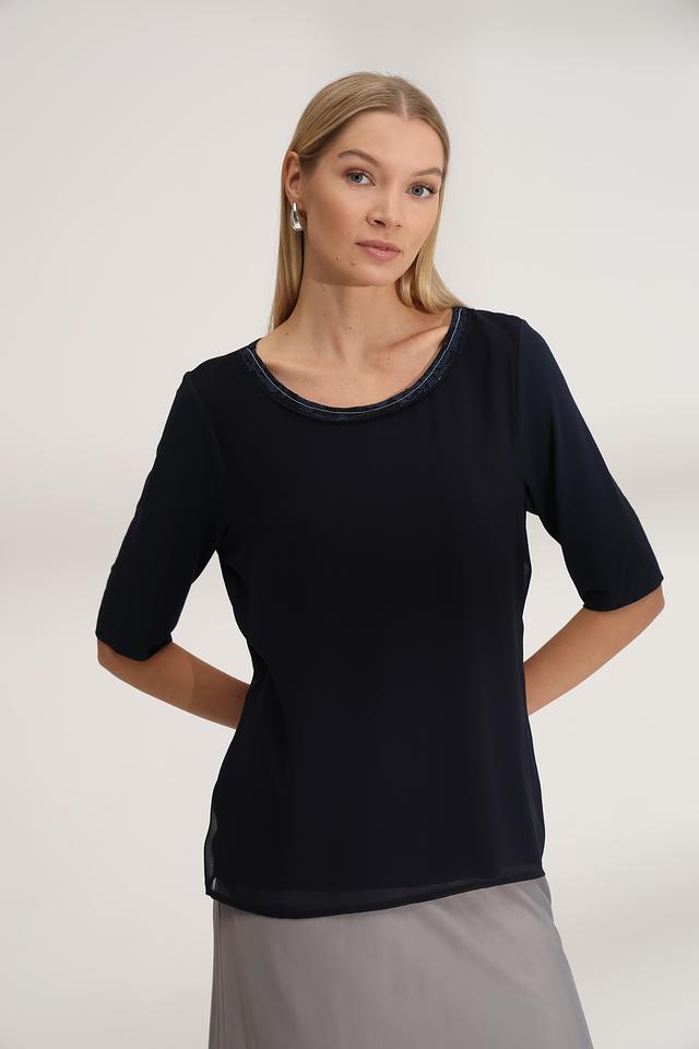 Тёмно-синяя блуза от SE Stenau с округлым вырезом, декорированным кружевом. Изготовлена из мягкой вискозы с добавлением эластана для комфорта и хорошей посадки. Состав: вискоза 96%, эластан 4%
