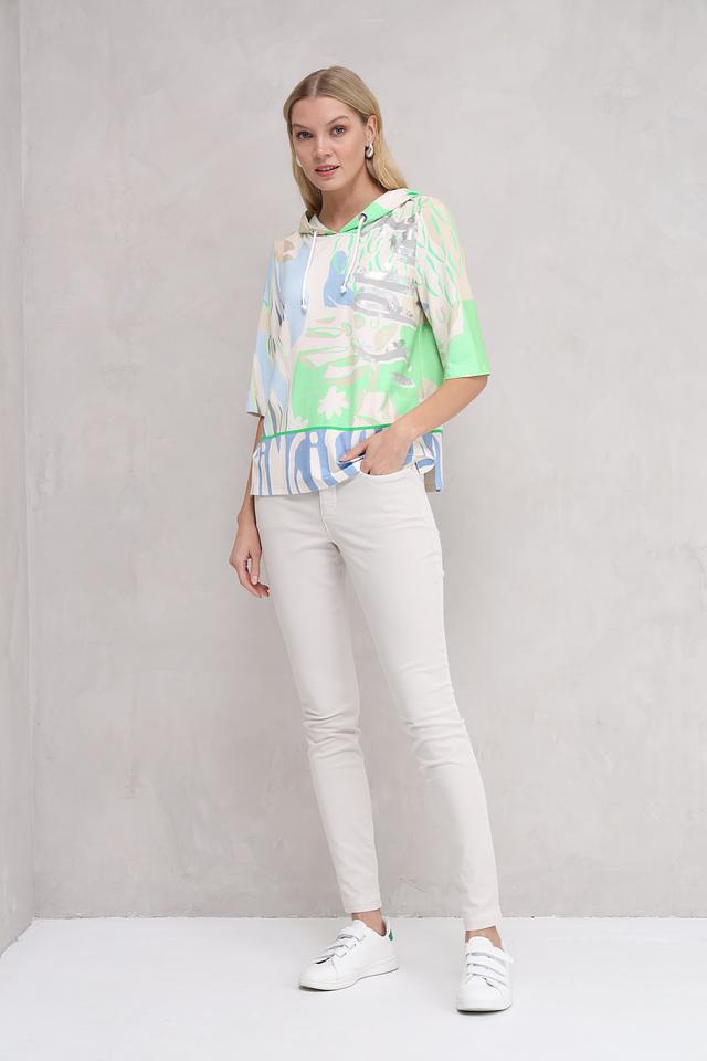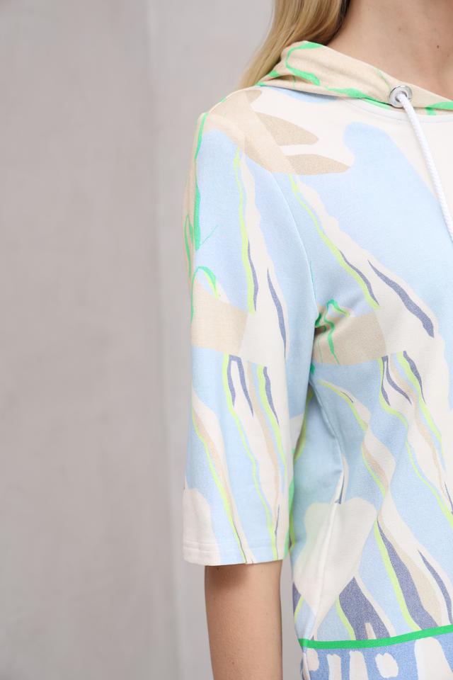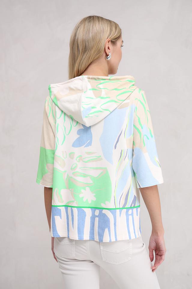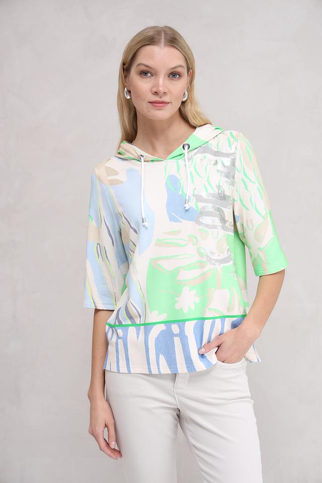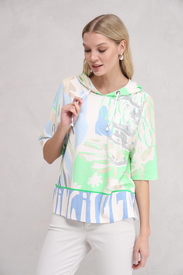 Блуза имеет свободный крой, короткие рукава и удобный капюшон с завязками. Главная особенность модели – оригинальный принт, сочетающий в себе абстрактные элементы и цветочные мотивы в нежных пастельных тонах.