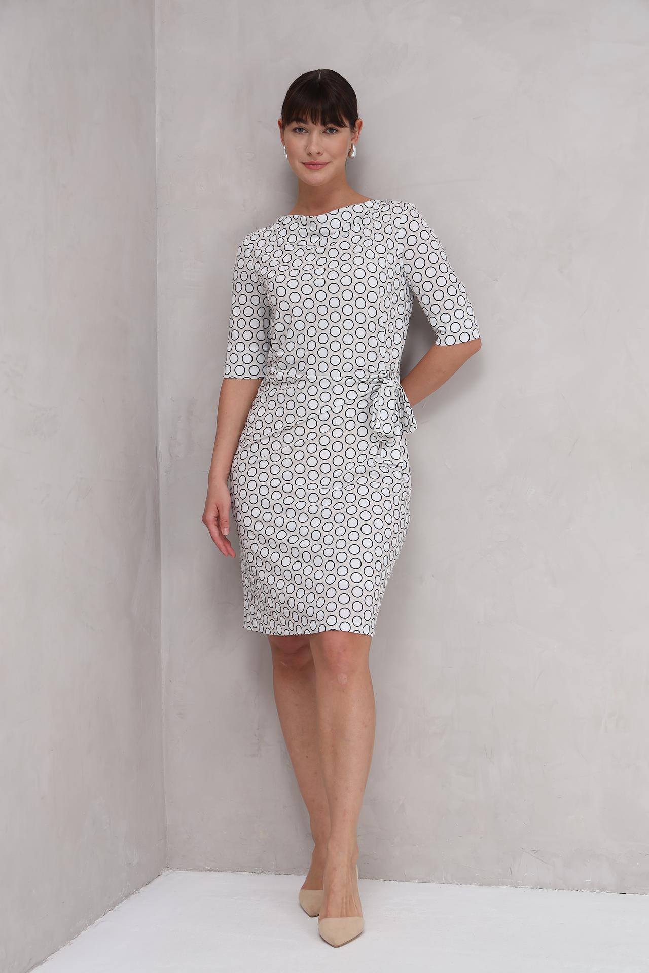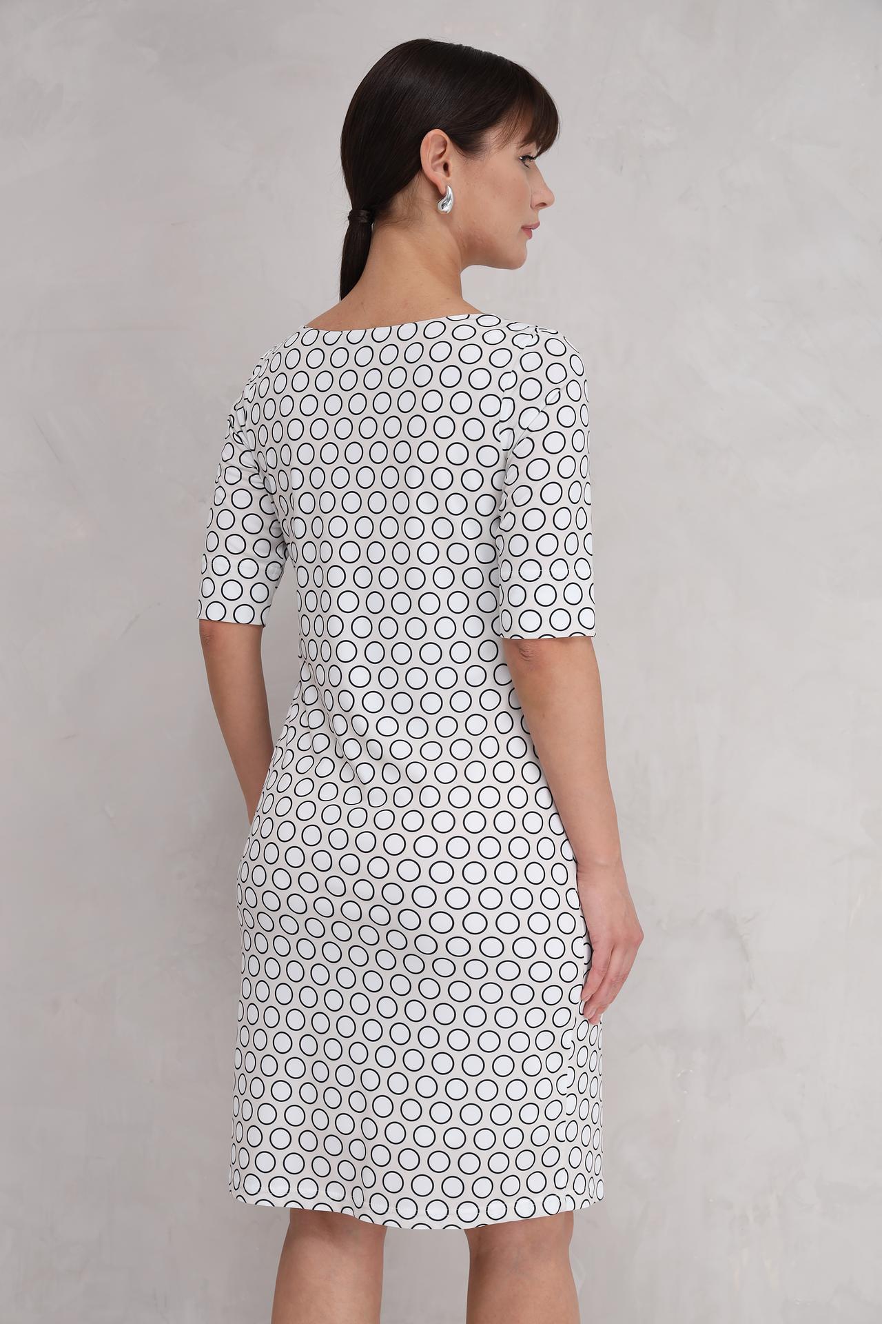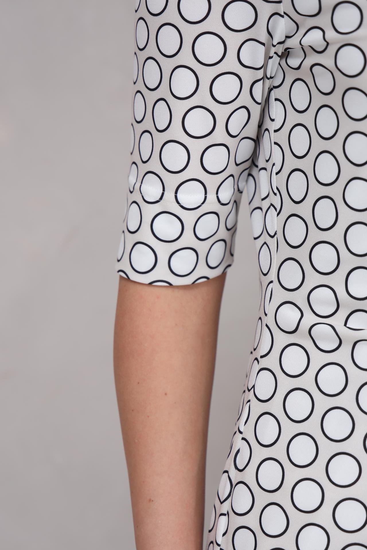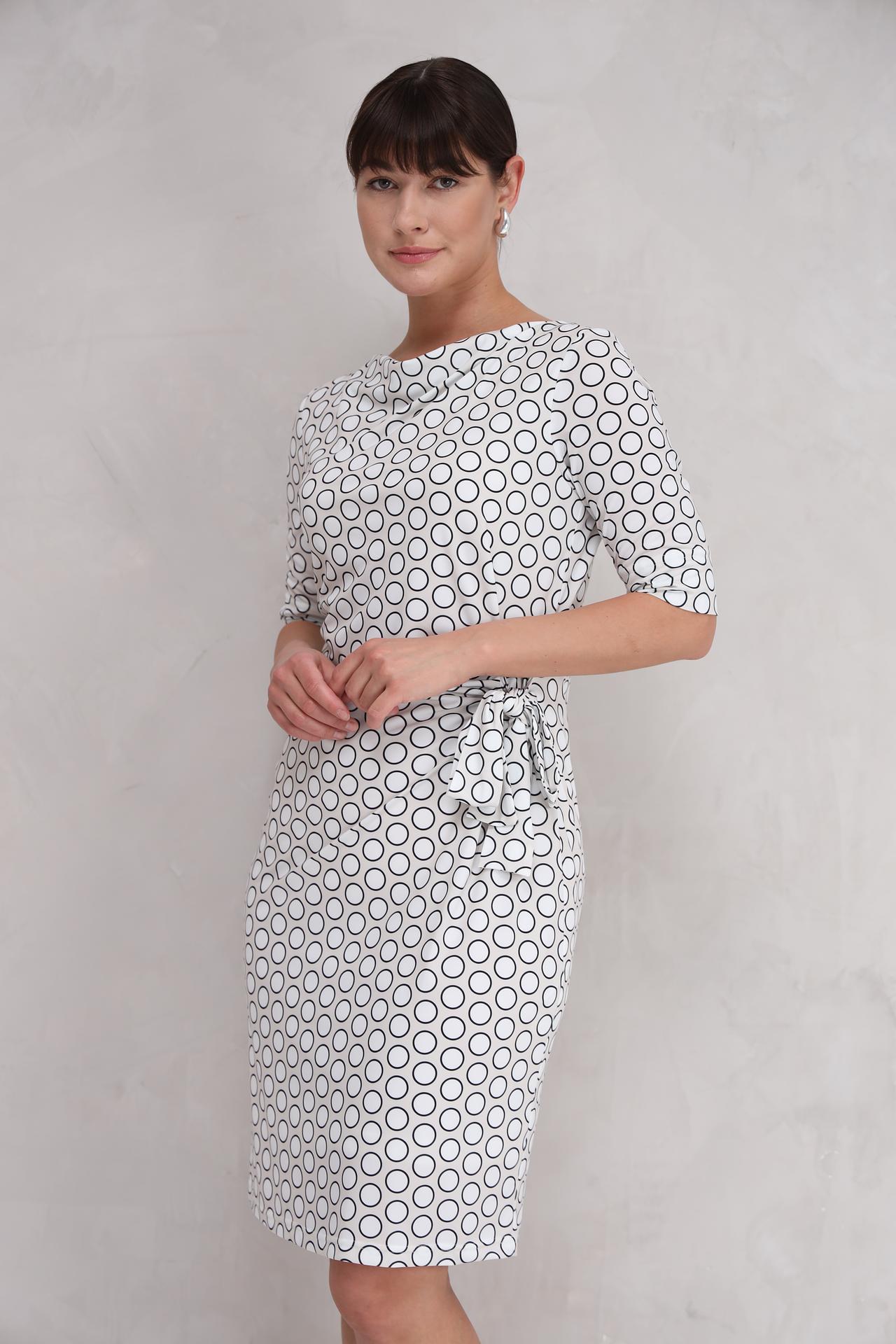 - Стильный дизайн: Модный принт в виде чёрных кругов на светлом фоне и классический силуэт делают платье актуальным для любого сезона и повода.