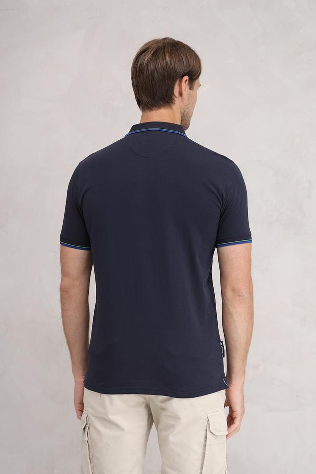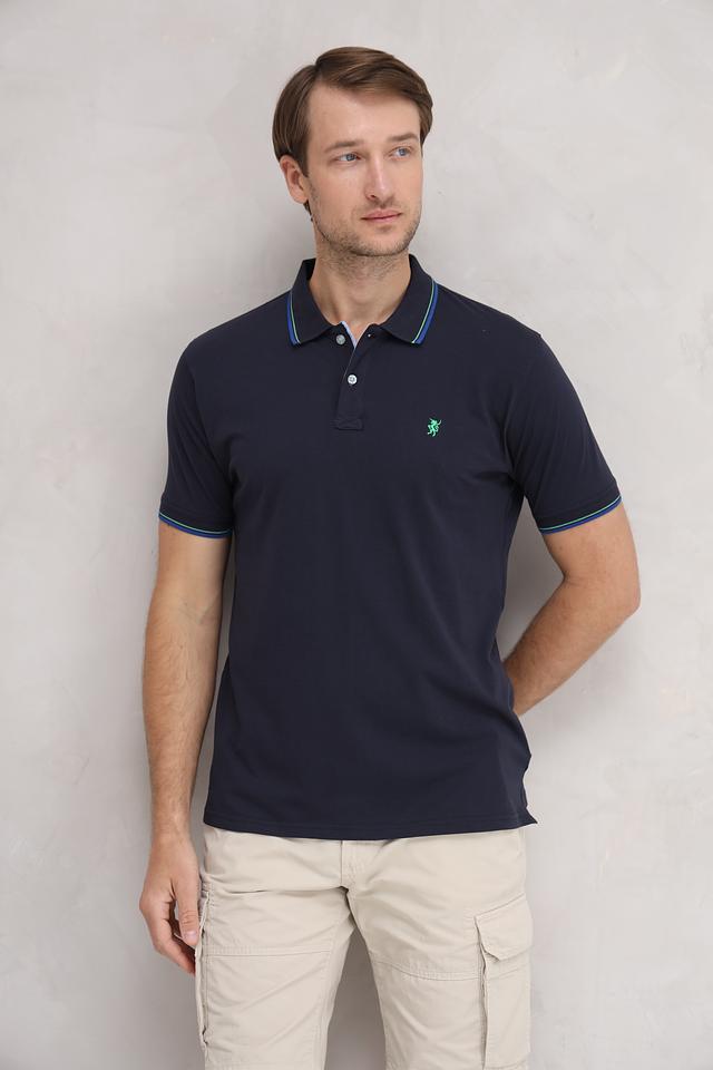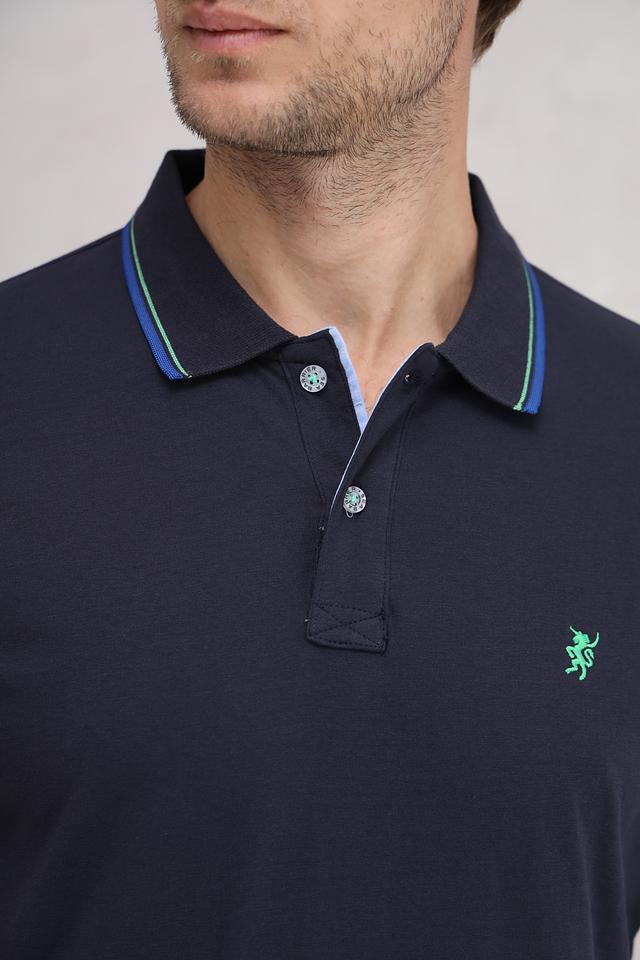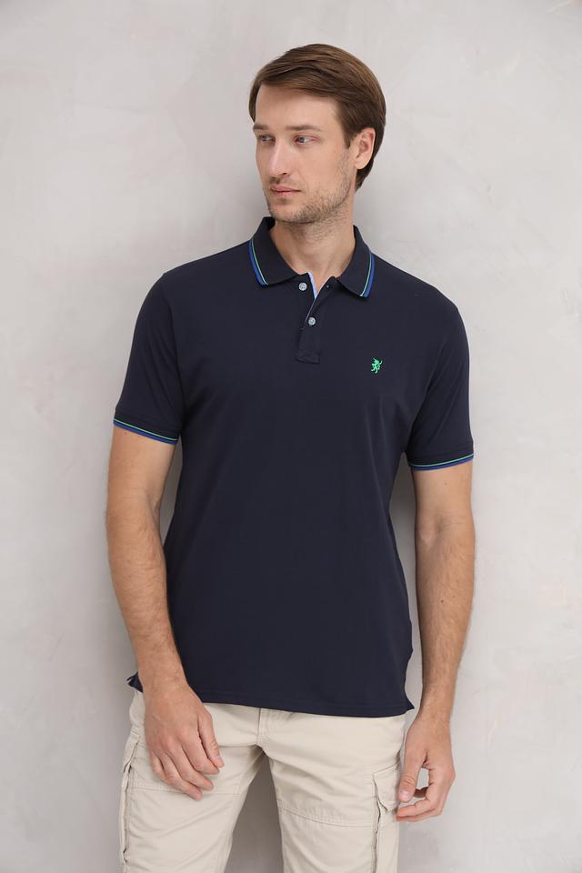 Классический крой поло идеально подходит для любого типа фигуры. Тёмно-синий цвет модели дополнен яркой контрастной отделкой на воротнике и рукавах, что придает ей особый шарм.