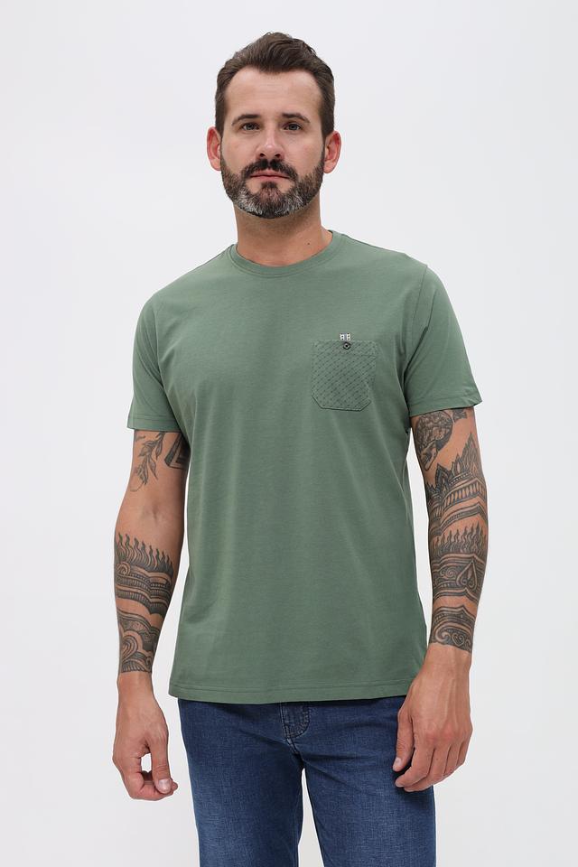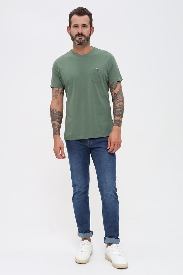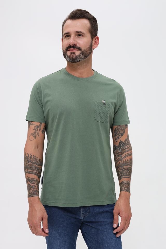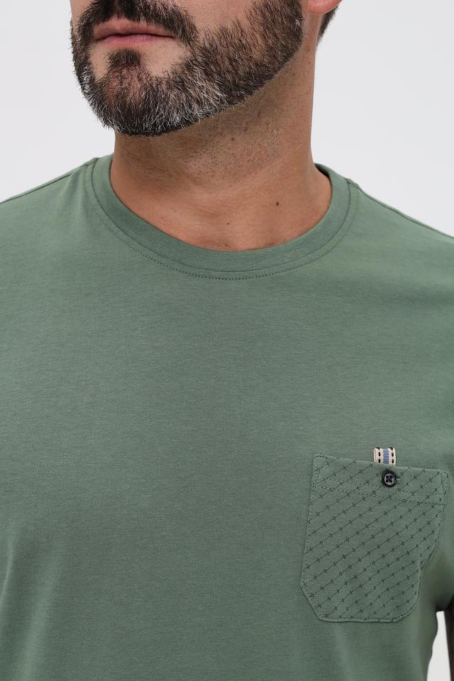 Особенностью данной футболки является накладной карман на груди, выполненный из текстурированной ткани с геометрическим рисунком. Карману придает завершенность аккуратная пуговица. Такой элемент дизайна добавляет футболке оригинальности и стиля.