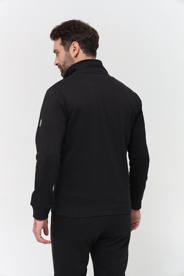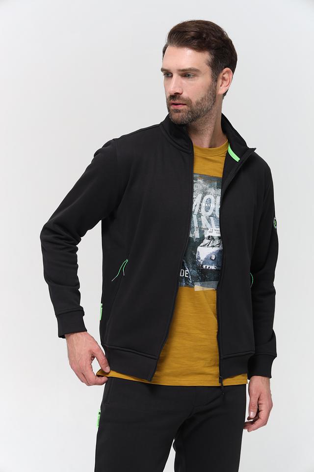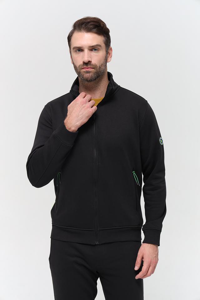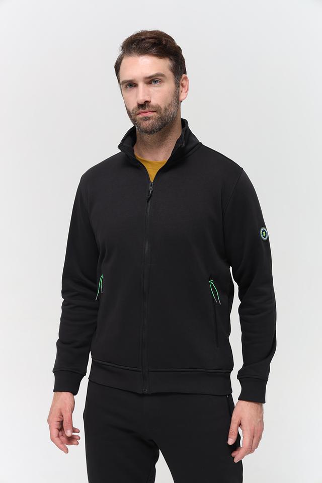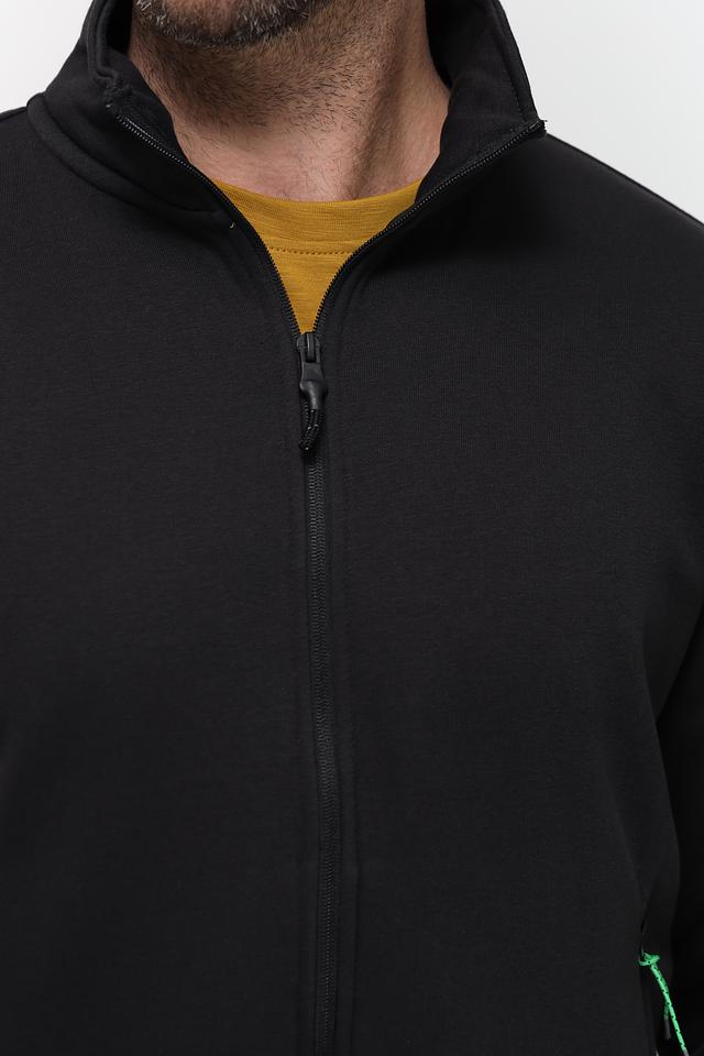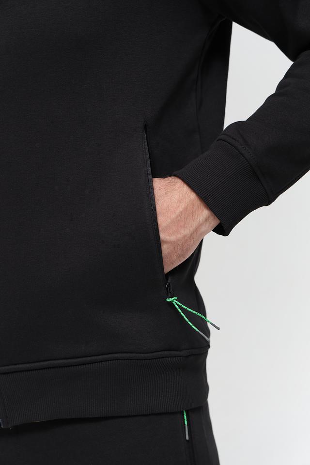 Кардиган имеет удобную застёжку на молнии, воротник-стойку и боковые карманы. Декоративные зелёные вставки на молнии и рукавах добавляют изделию современный акцент. На левом рукаве расположен логотип бренда.