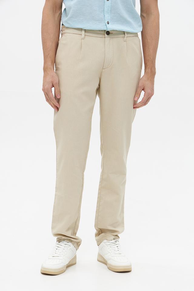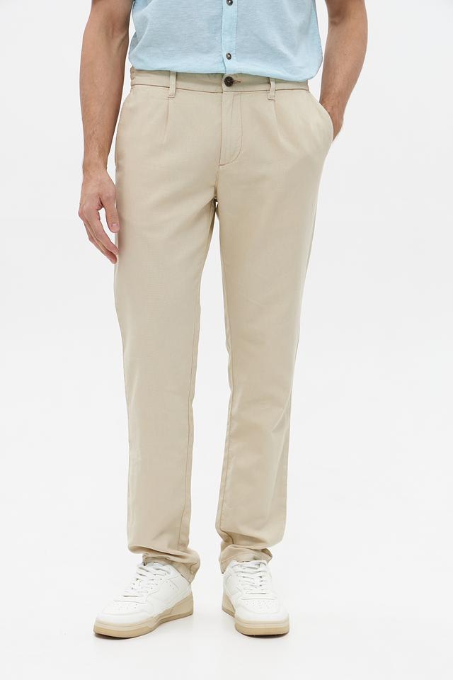 Брюки имеют классический крой с прямыми штанинами, что делает их универсальными для различных образов. Ткань состоит из хлопка, лиоцелла и льна, обеспечивая воздухопроницаемость и приятные тактильные ощущения. Состав: хлопок 64%, лиоцел 25%, лен 11%.