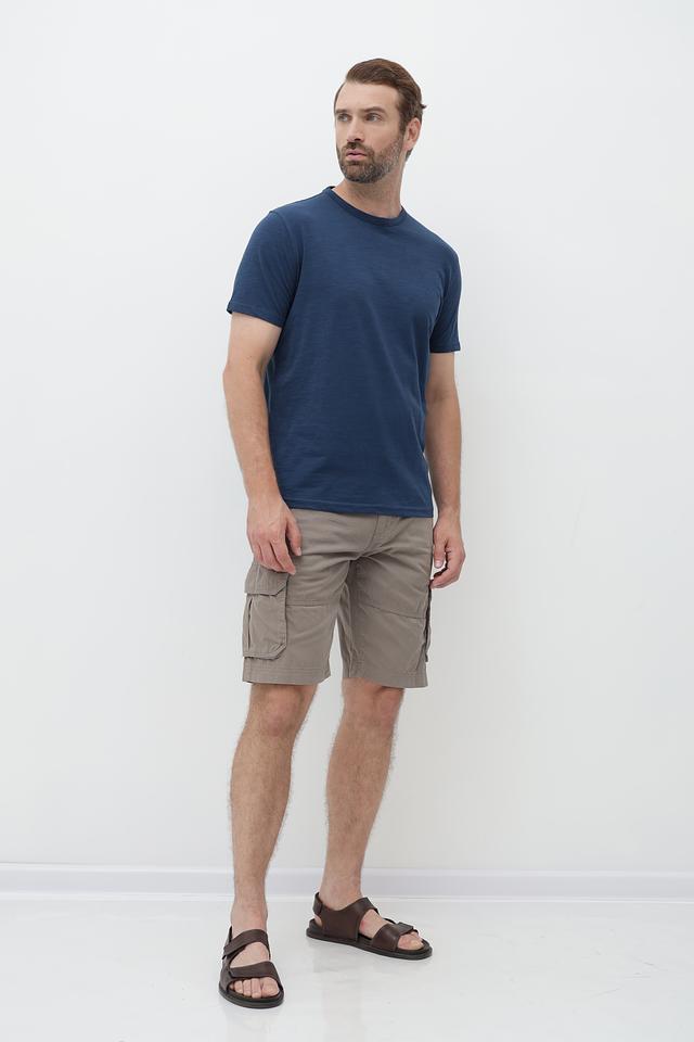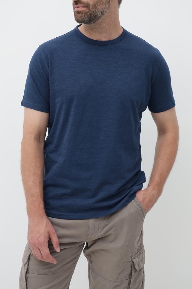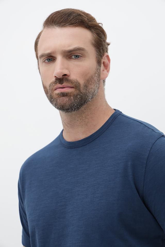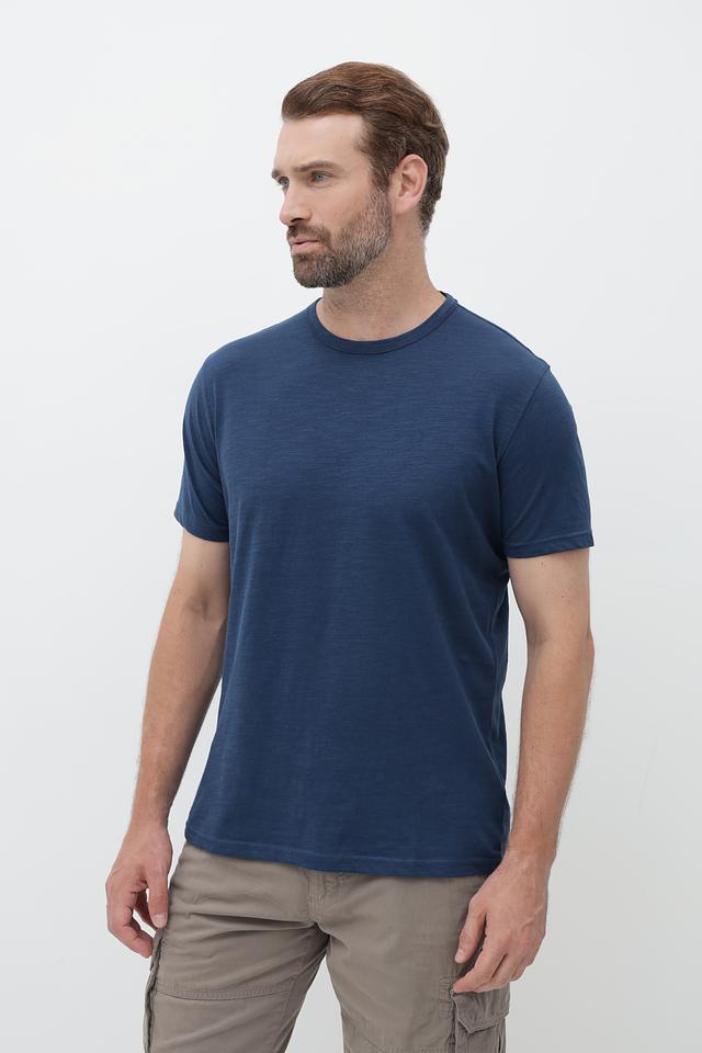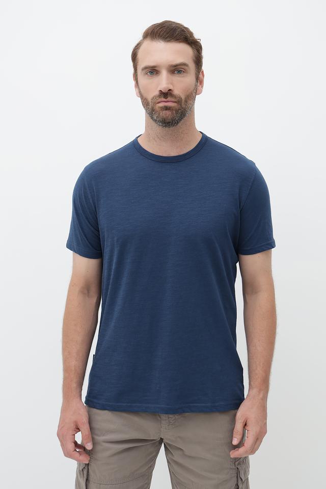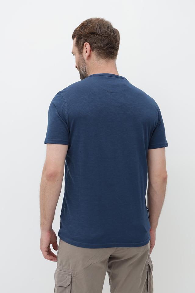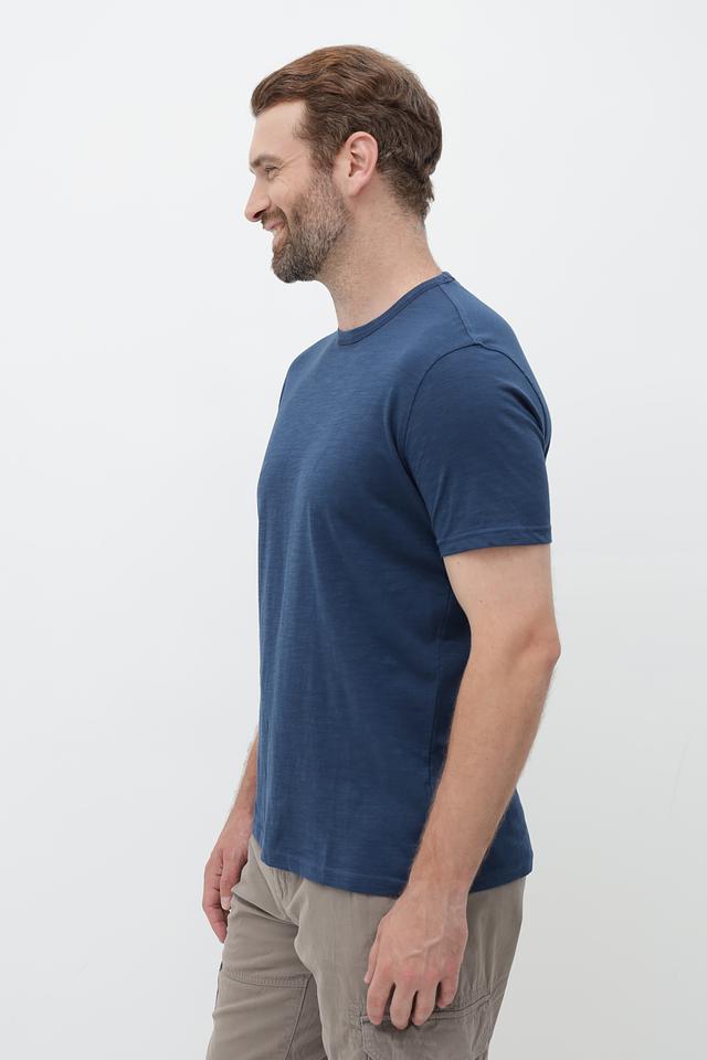 Футболка имеет классический прямой крой, который подходит для большинства типов фигур. Тёмно-синий цвет делает её универсальной и легко сочетаемой с другими элементами гардероба.