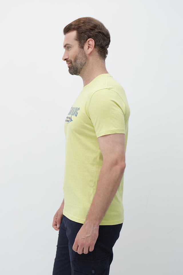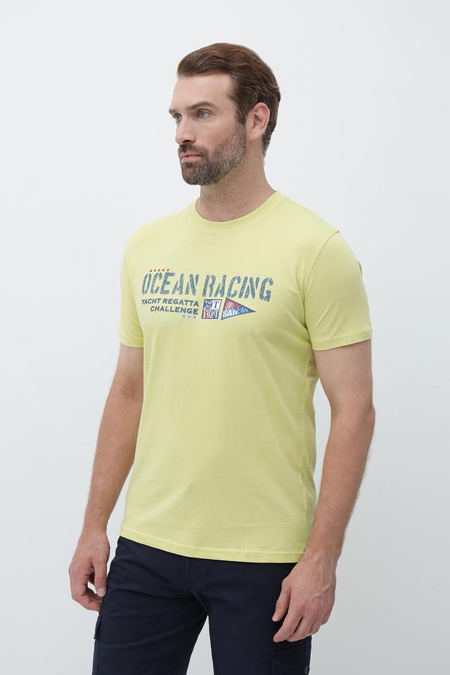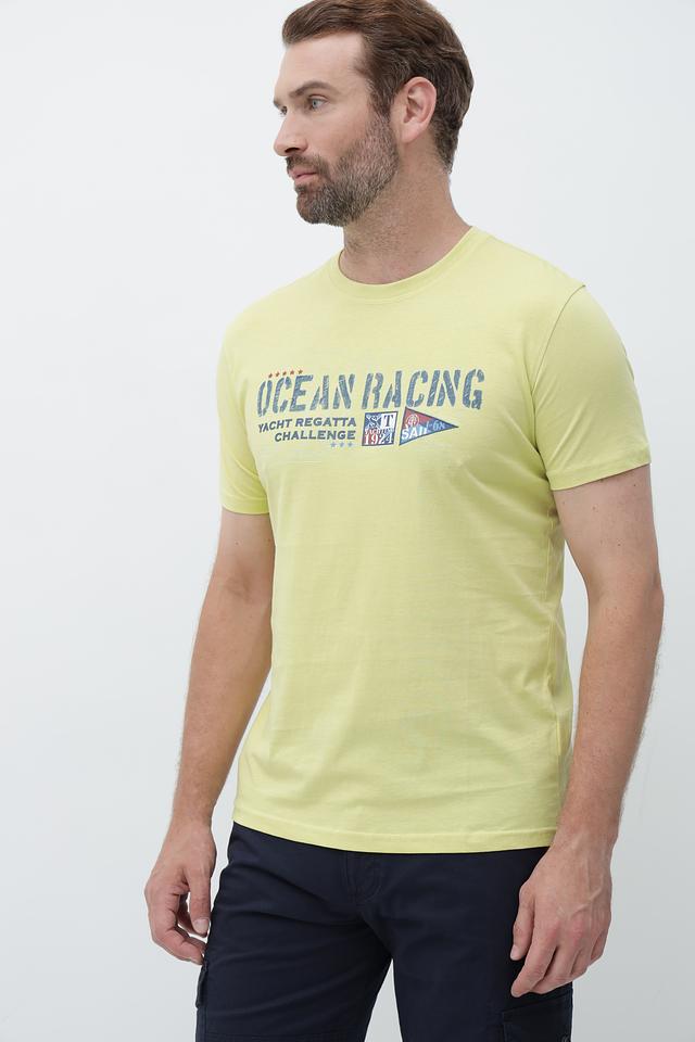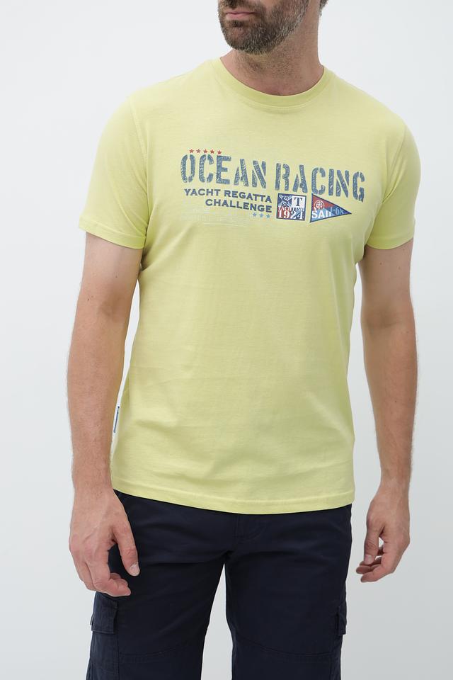 Мужская футболка Sea Barrier светло-жёлтого цвета с ярким принтом "Ocean Racing". Изготовлена из 100% хлопка, обеспечивающего комфорт и воздухопроницаемость. Состав: хлопок 100%