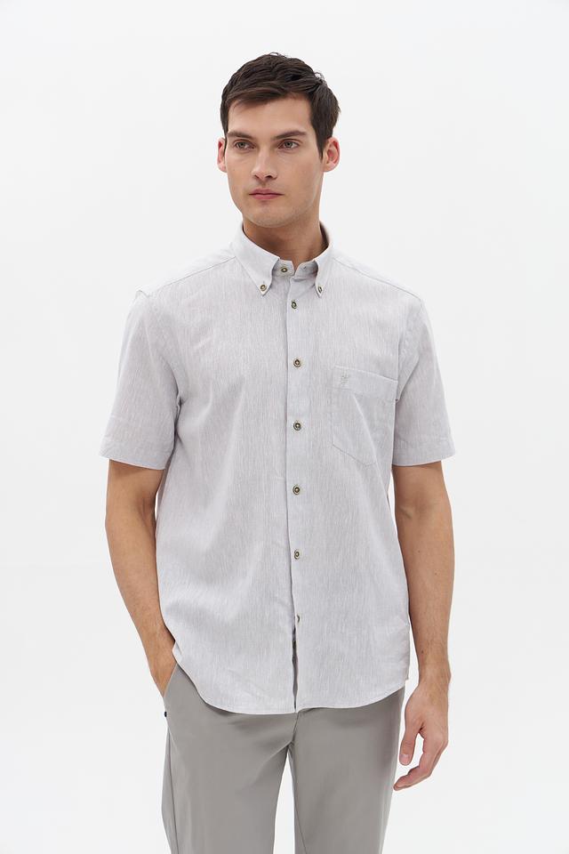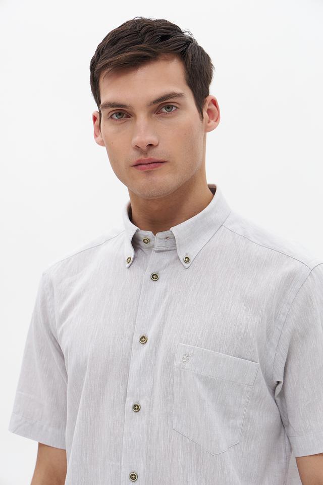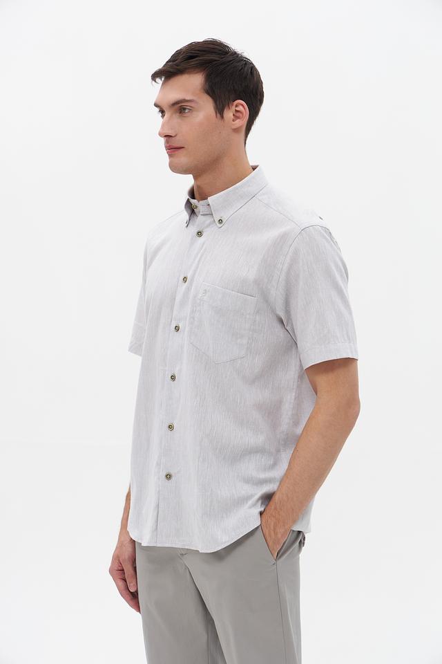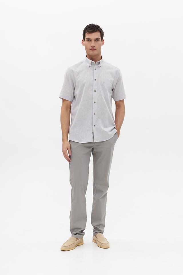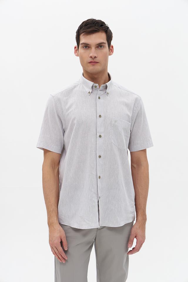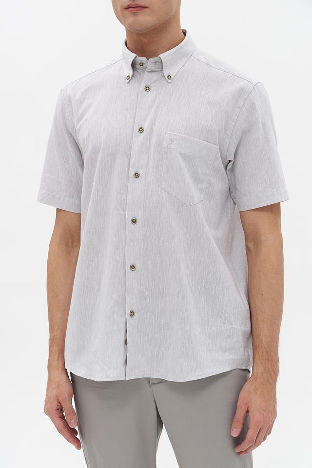 Рубашка имеет классический крой, короткие рукава и воротник с пуговицами. Текстура ткани с лёгкой продольной полоской придает рубашке изысканный вид. Цвет рубашки – светло-серый, нейтральный и универсальный, легко сочетается с различными элементами гардероба.