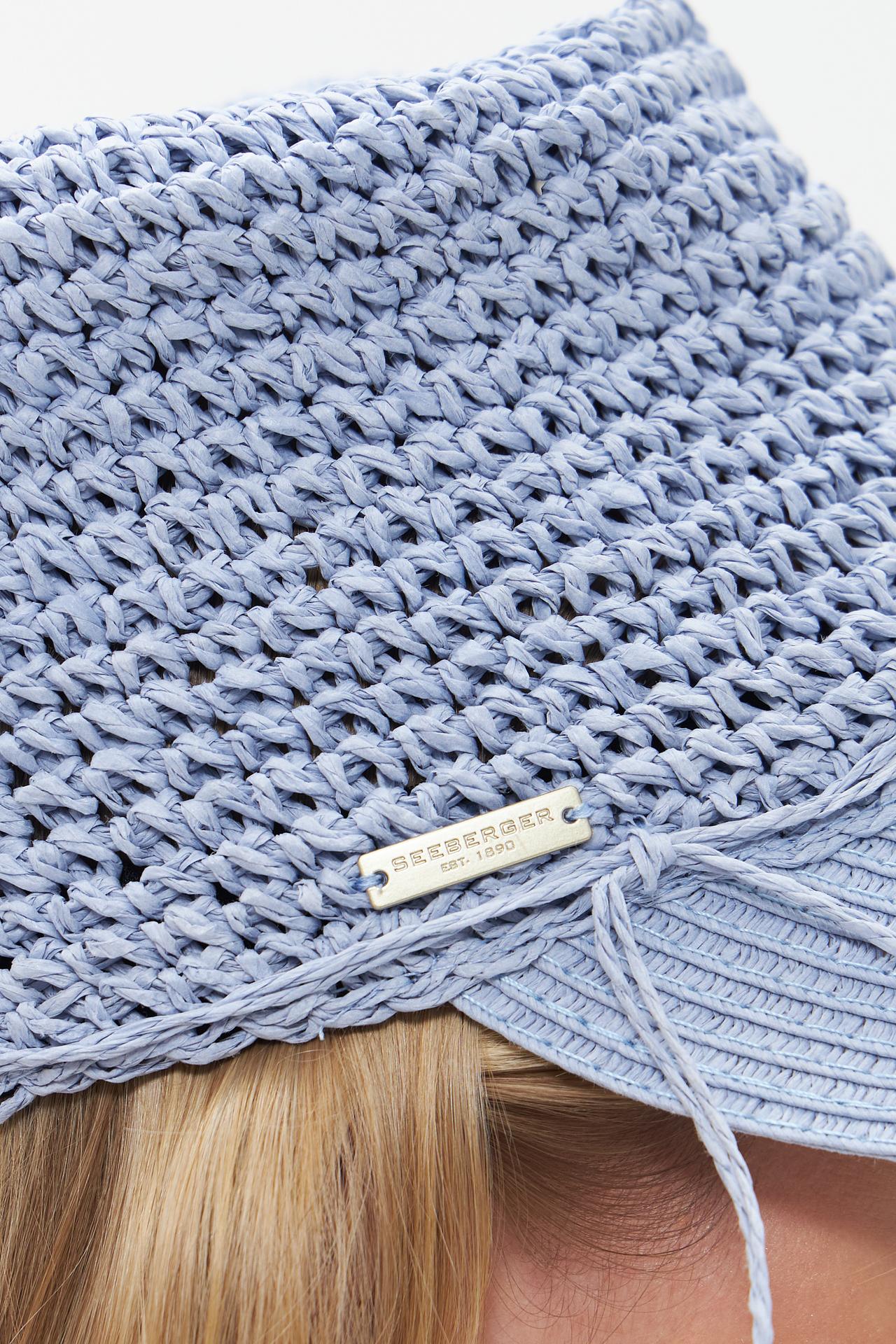 - Элегантный дизайн. Классическая форма бейсболки в сочетании с изысканным плетением и аккуратной металлической планкой с логотипом Seeberger придает ей утонченный вид. Легкий голубой оттенок подчеркивает летнее настроение.