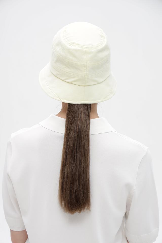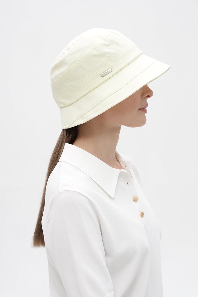 Шляпа выполнена в нежном бежевом цвете, который легко сочетается с различными нарядами. Её форма напоминает популярную модель bucket hat, придавая образу современный и непринужденный вид.