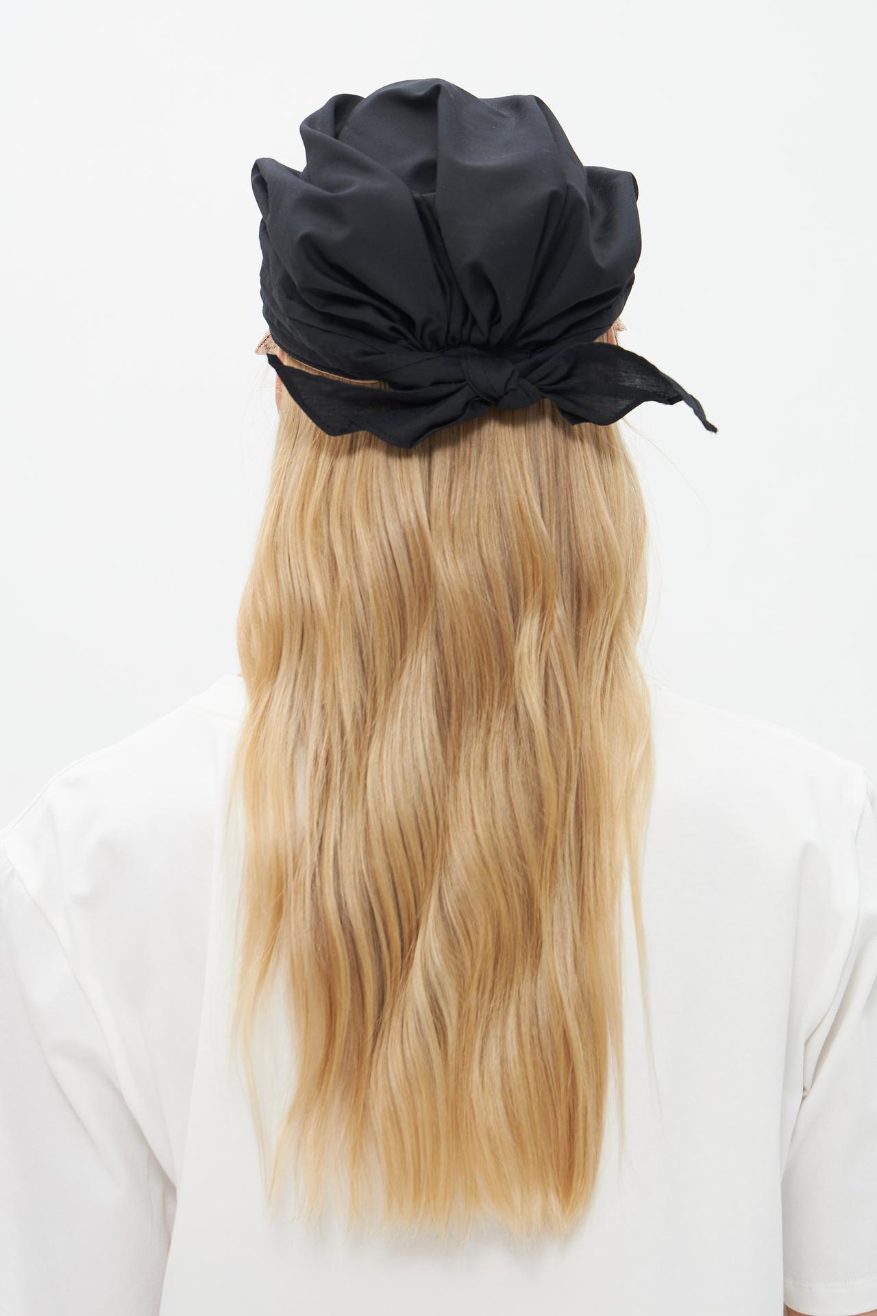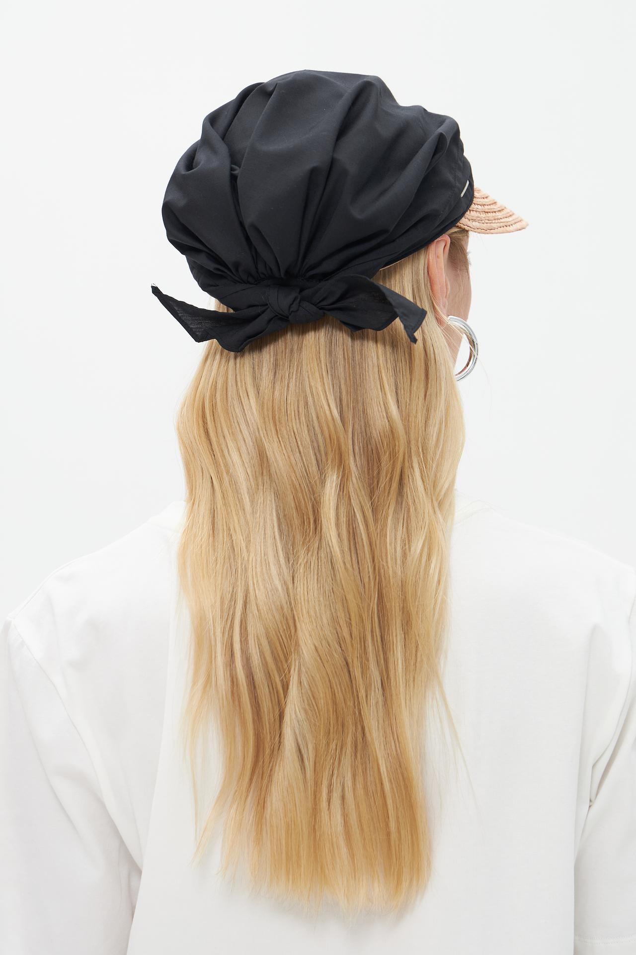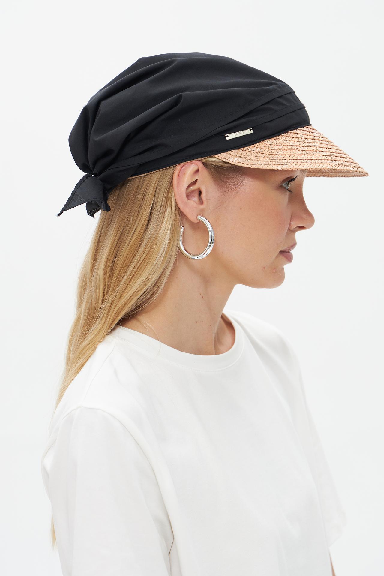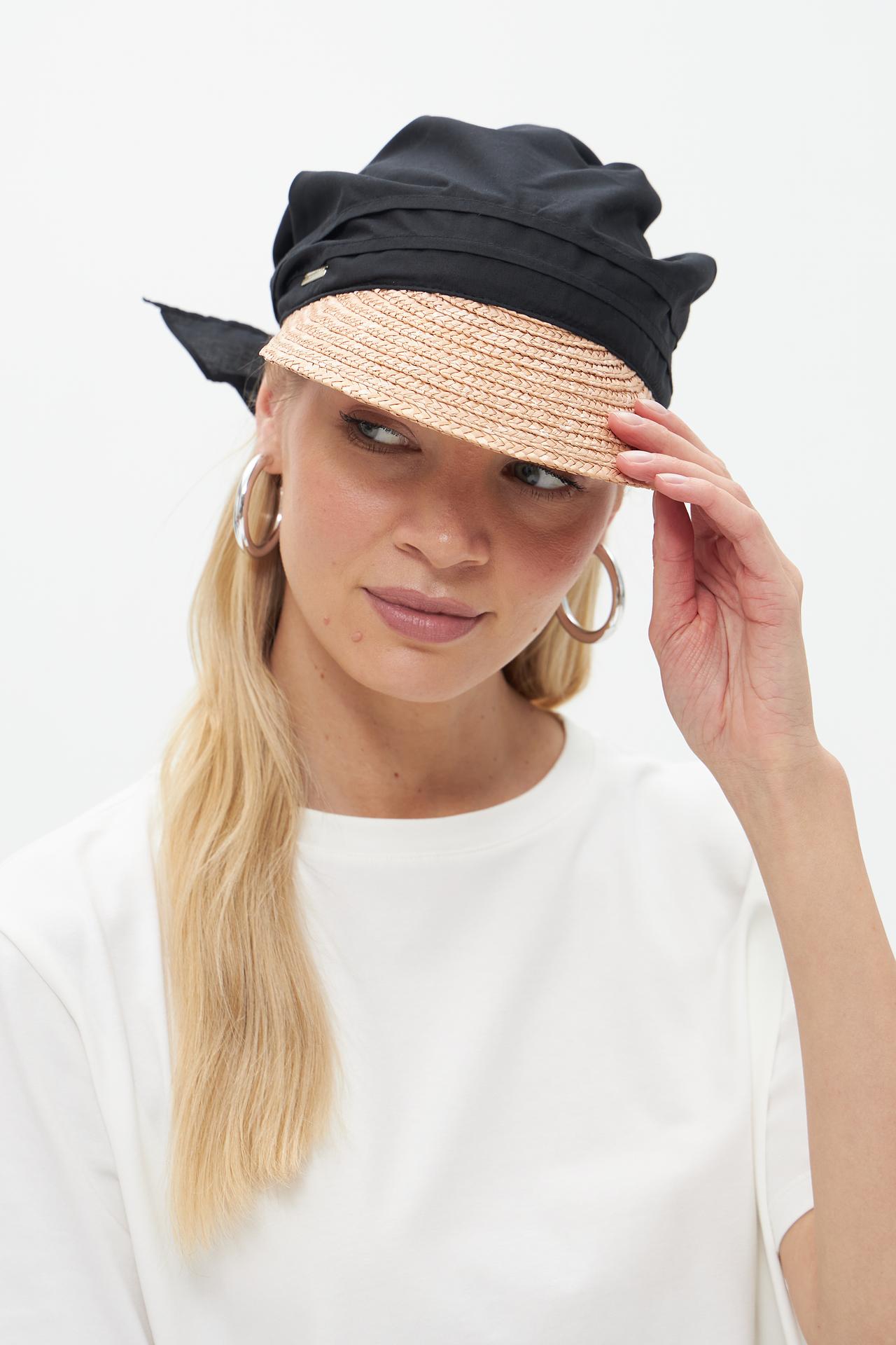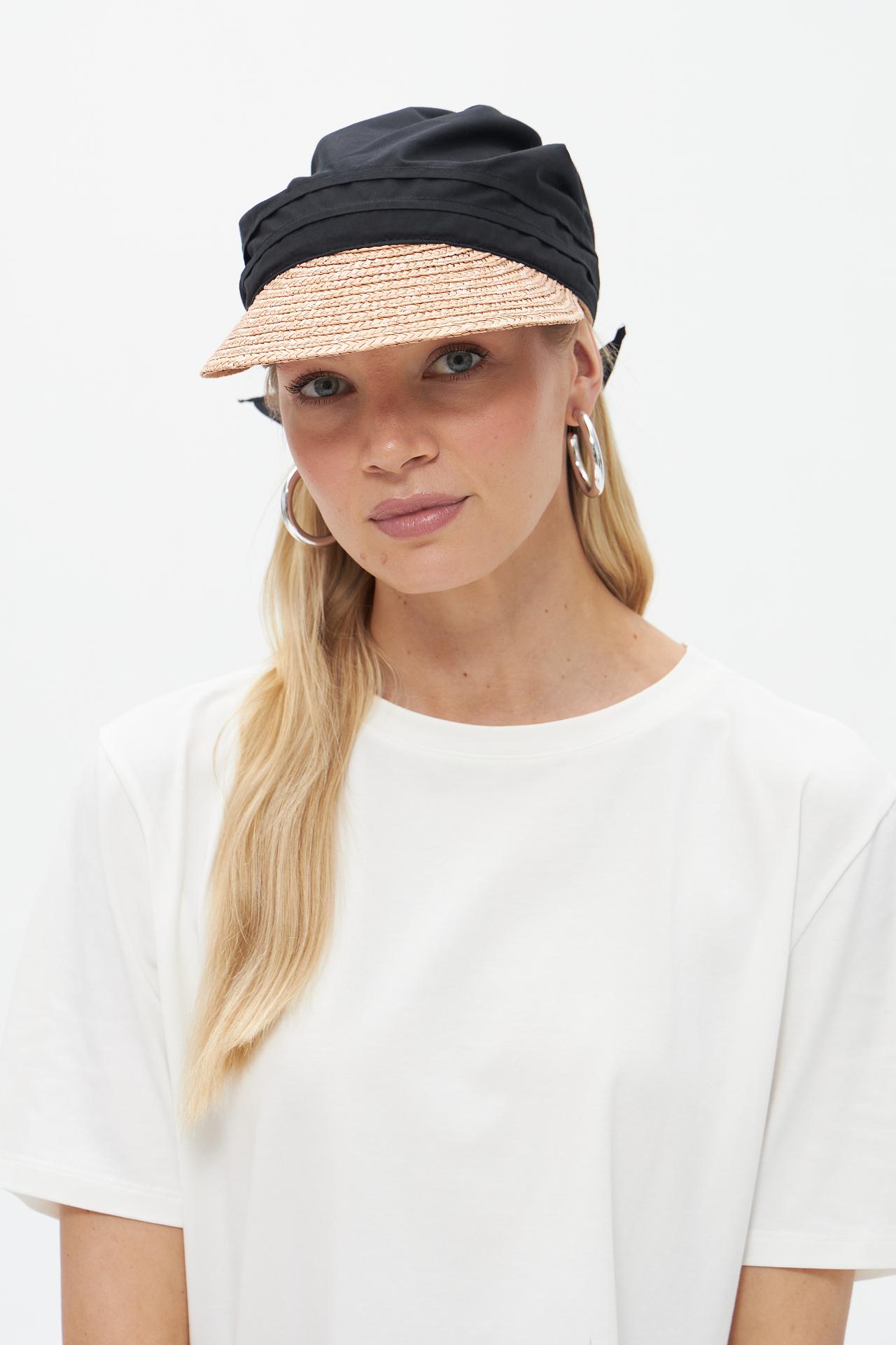 - Дизайн: Модель отличается оригинальным дизайном с объемным верхом и плетеным козырьком. Черная ткань драпируется, образуя элегантные складки, а натуральный цвет козырька придает изделию особый шарм. Декоративный бант сзади добавляет изысканности.