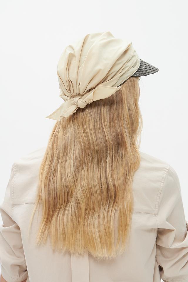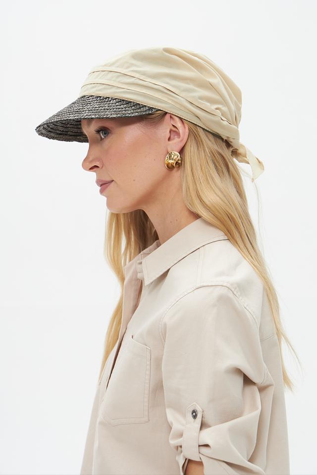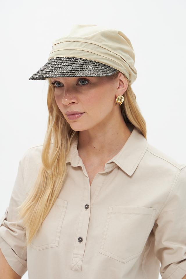 Кепка выполнена в нежном бежевом цвете, который легко сочетается с различными нарядами. Козырек выполнен из плетеного материала, что придает модели особый шарм. Завязки позволяют регулировать посадку кепки, обеспечивая комфорт при носке.