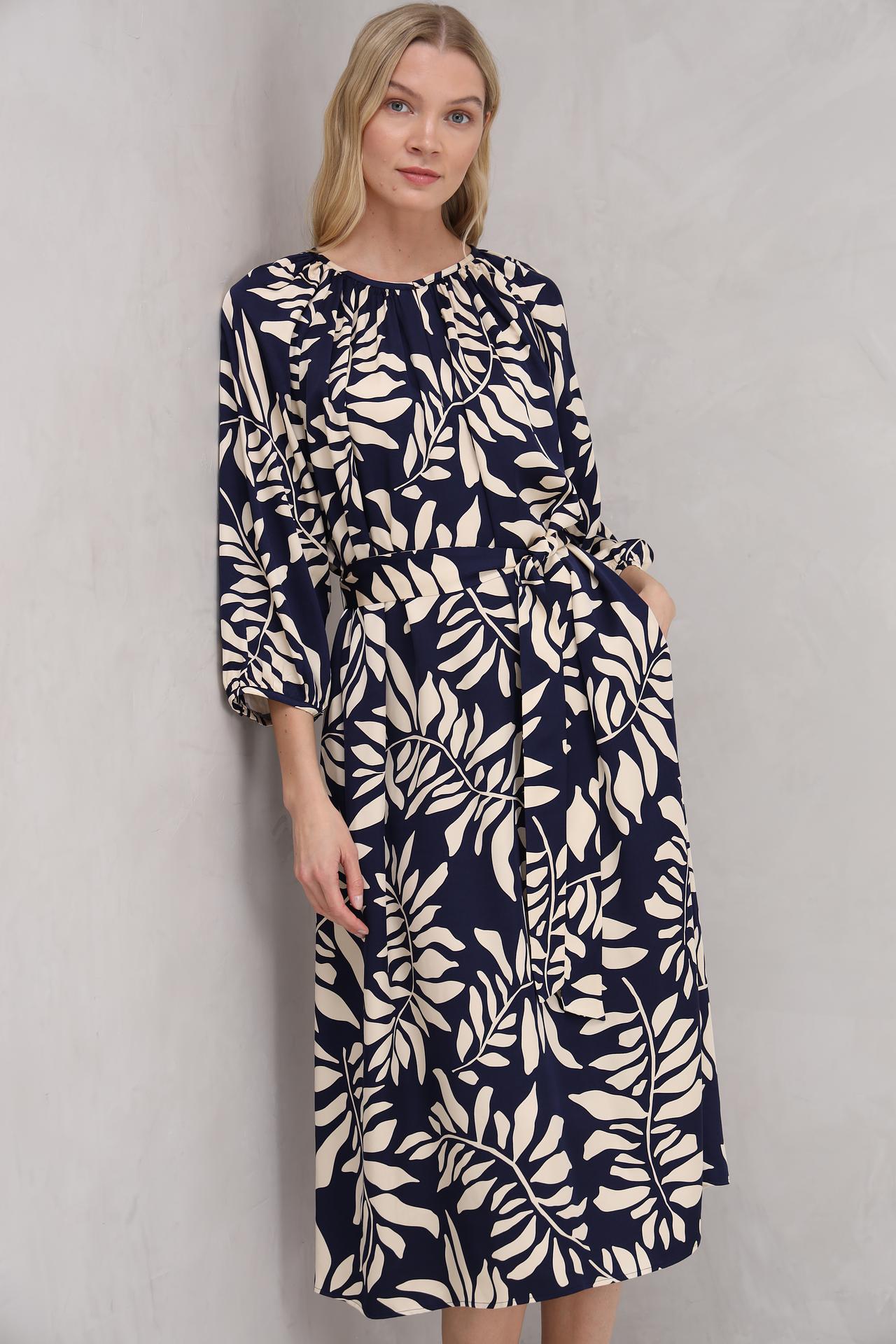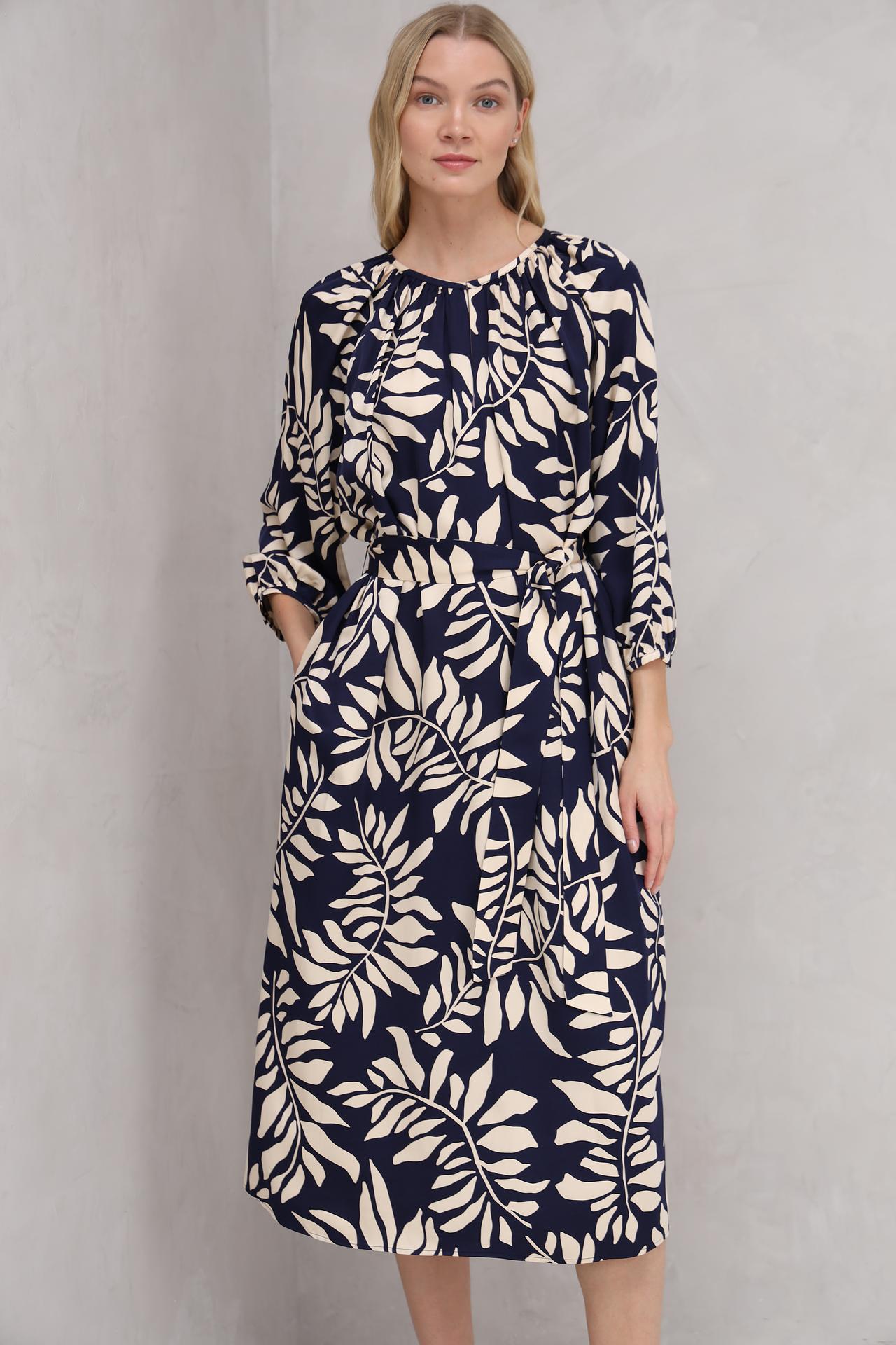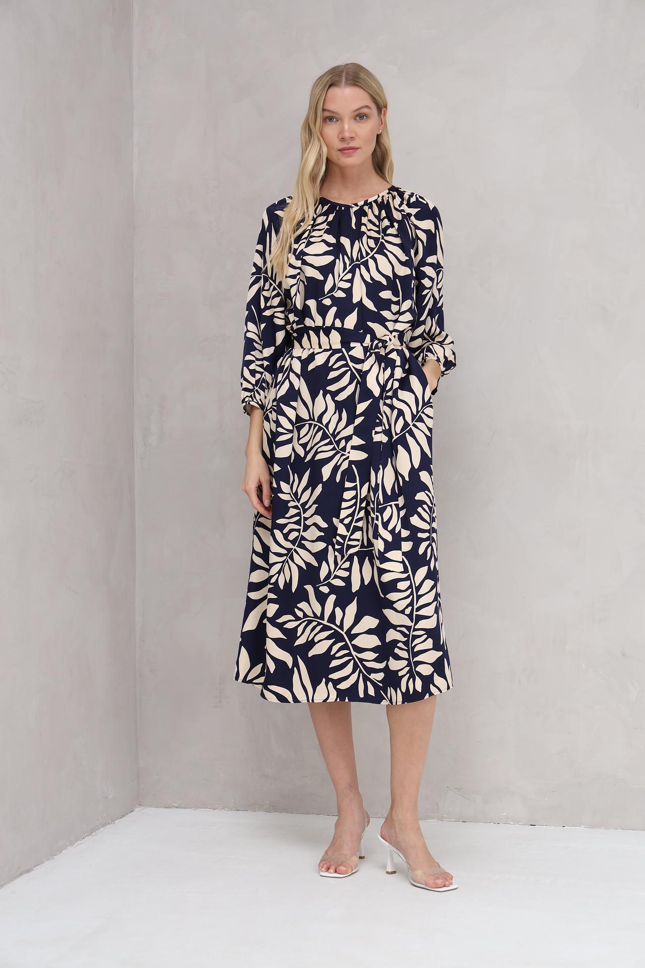 - Уникальный принт. Темно-синий фон украшен крупным бежевым узором из стилизованных листьев, что придает платью особую выразительность и актуальность. Этот рисунок выделяет изделие, делая его ярким акцентом в образе.