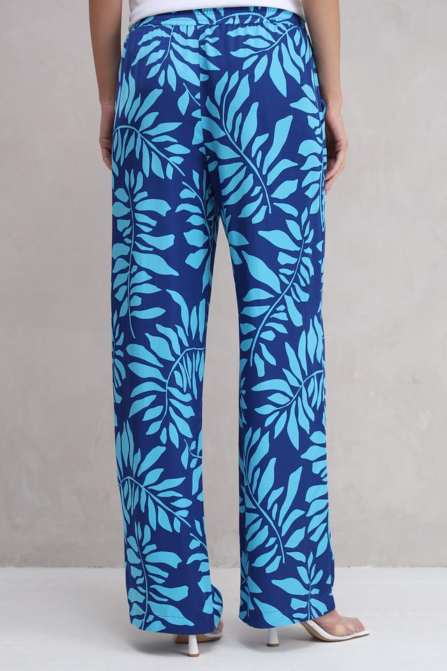 Яркий синий цвет в сочетании с оригинальным цветочным принтом привлекает внимание и подчеркивает индивидуальность. Прямой крой обеспечивает свободу движений, а эластичный пояс гарантирует комфортную посадку по фигуре.
