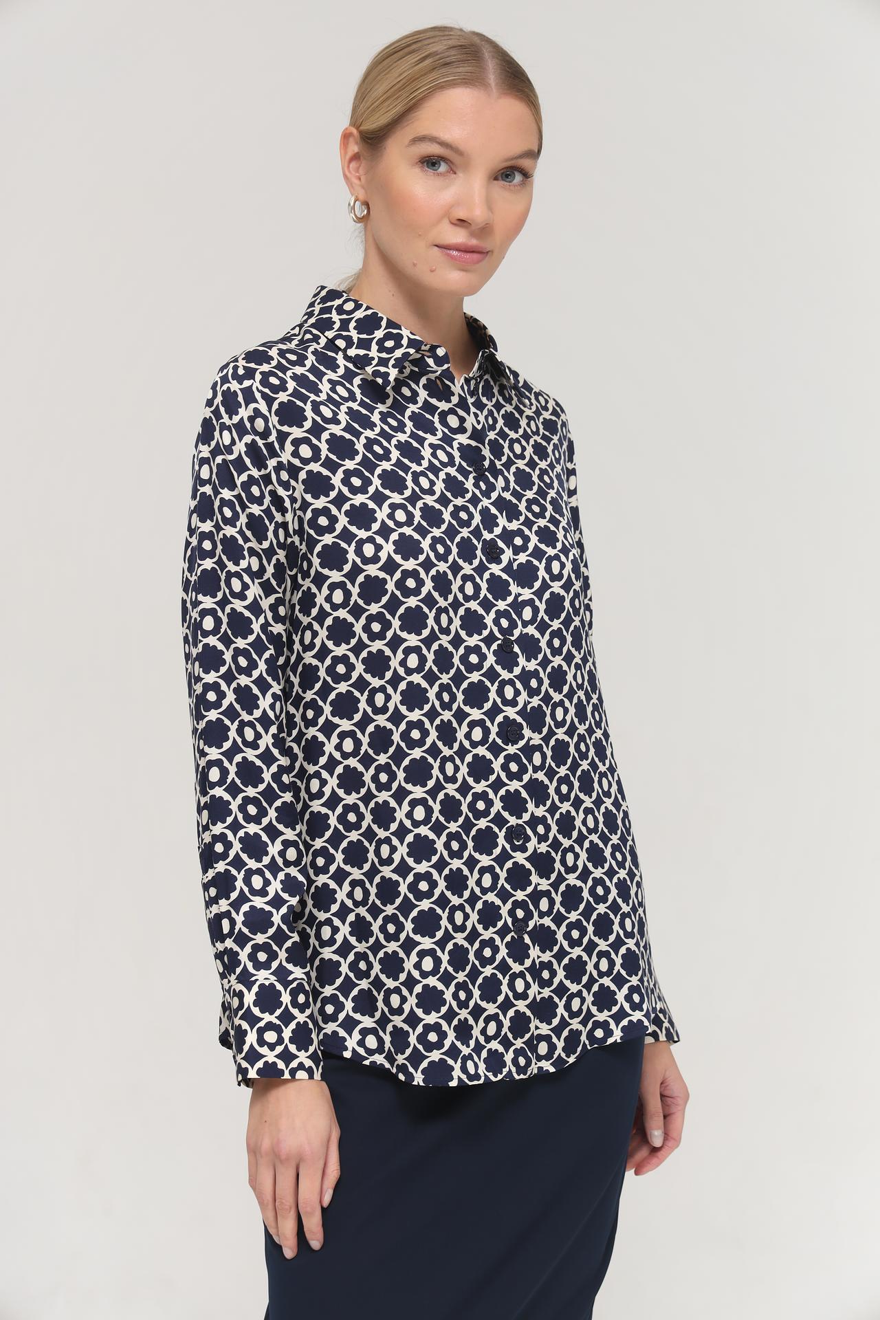 - Универсальный дизайн: Классический крой и стильный геометрический узор позволяют легко комбинировать офисную блузу как с деловыми юбками и брюками, так и с джинсами для создания расслабленного образа.