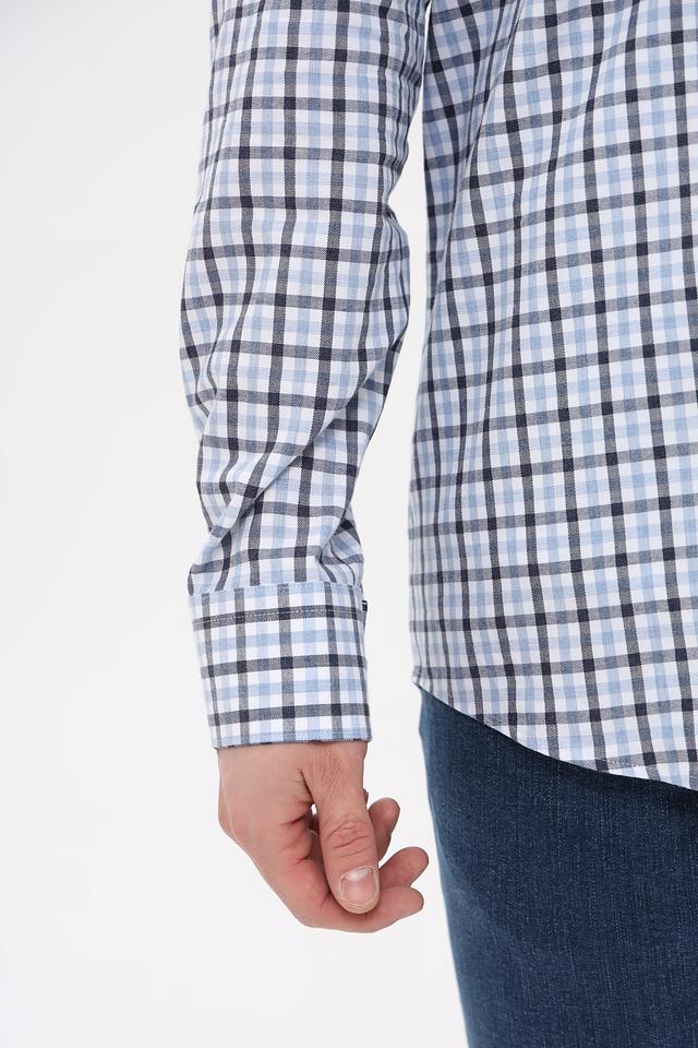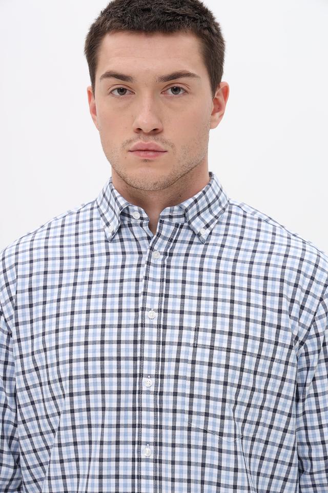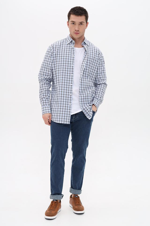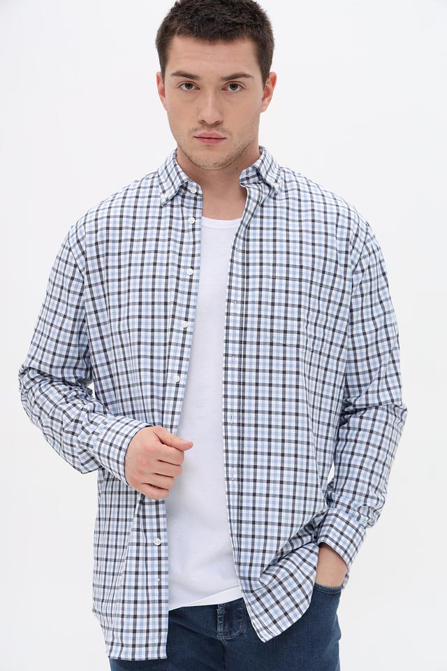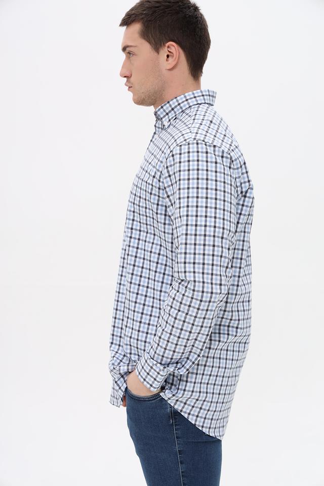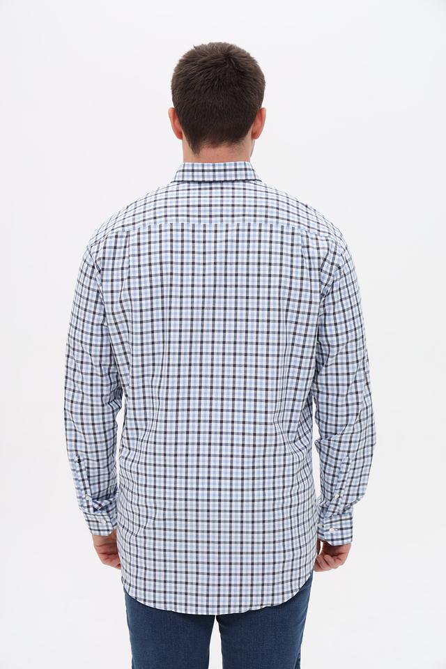 Рубашка имеет классический крой и оформлена в клетку, сочетающую голубой, черный и белый цвета. Это делает ее универсальной и подходящей для различных стилей одежды – от повседневного до более формального.