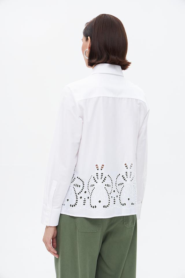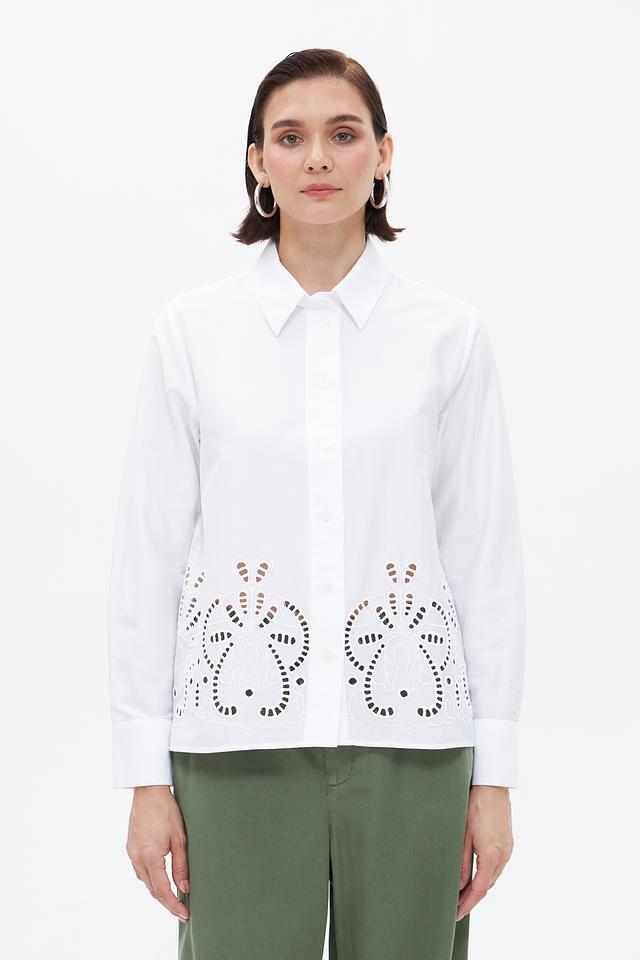 Особенностью данной модели является декоративная вышивка в виде цветочных мотивов на нагруди, придающая ей изысканность и женственность. Блузка застегивается на пуговицы по всей длине. Она идеально подойдет для создания как деловых, так и повседневных образов.