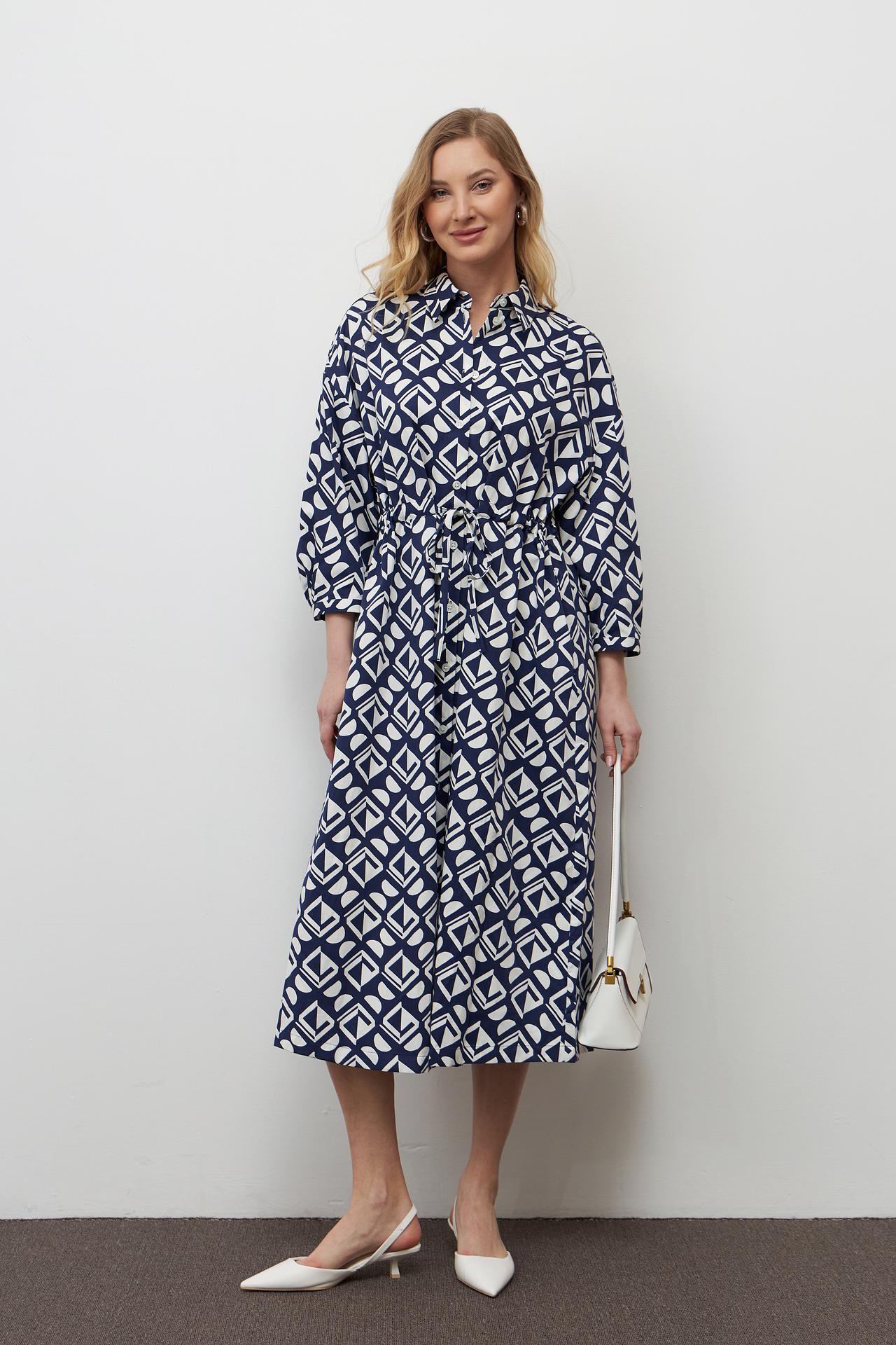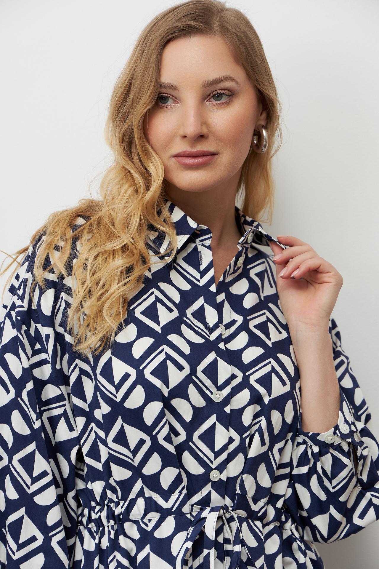 Элегантное платье-рубашка от Seidensticker, выполненное из 100% хлопка, станет незаменимой вещью в вашем гардеробе. Платье миди длины с геометрическим принтом в синих и белых тонах сочетает в себе классический стиль и современный дизайн. Идеально подходит для создания утонченных образов на каждый день и для особых случаев.
