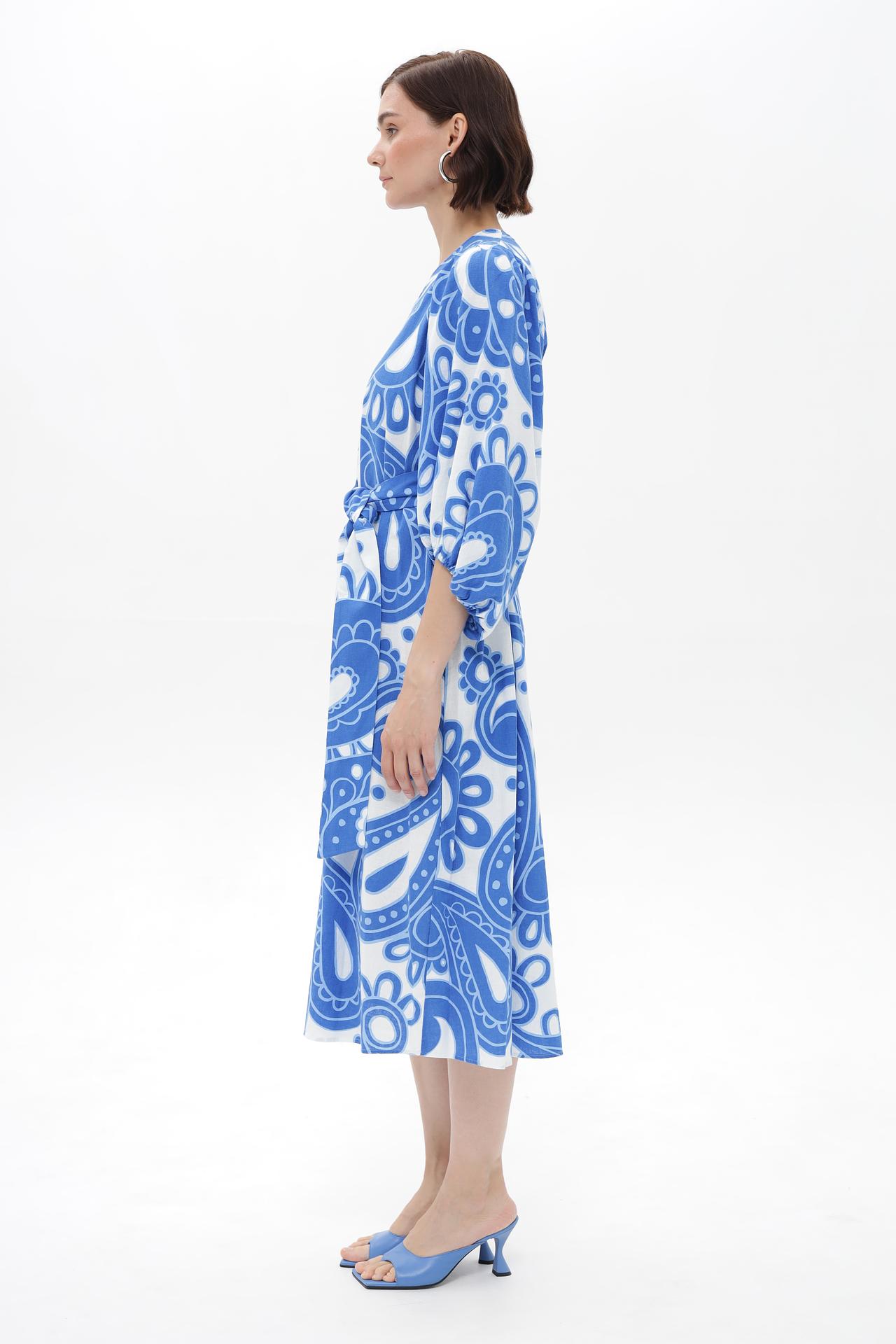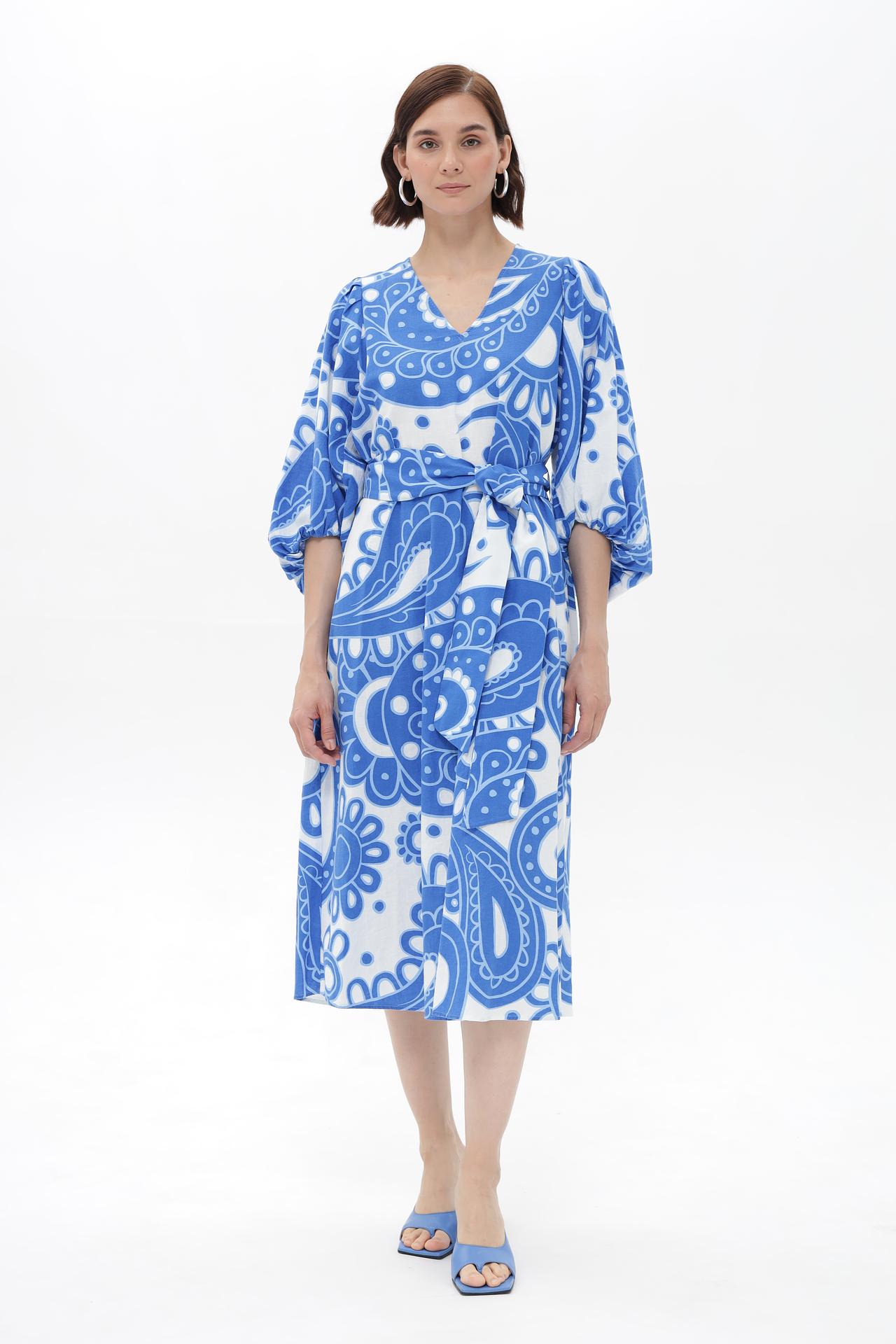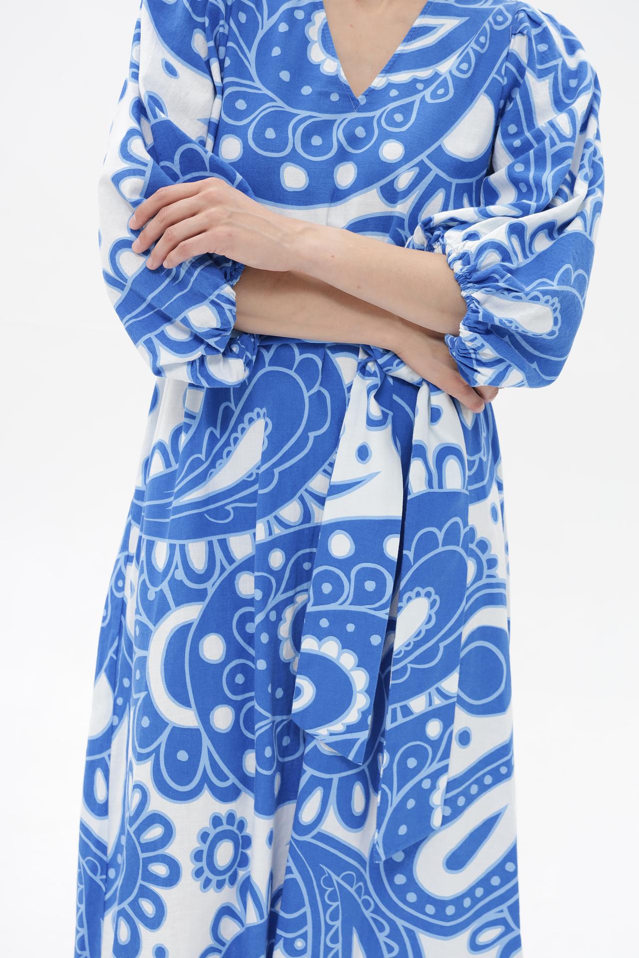- Дизайн: Платье выполнено в синем цвете с ярким принтом, добавляющим образу оригинальности.