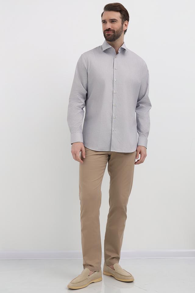 Рубашка имеет классический крой с длинными рукавами и стандартной посадкой. Воротник рубашки выполнен в классическом стиле, подходящем для ношения с галстуком или без него. Застежка на пуговицы по всей длине обеспечивает удобство и надежность.