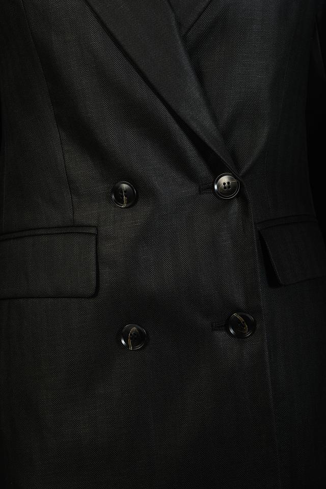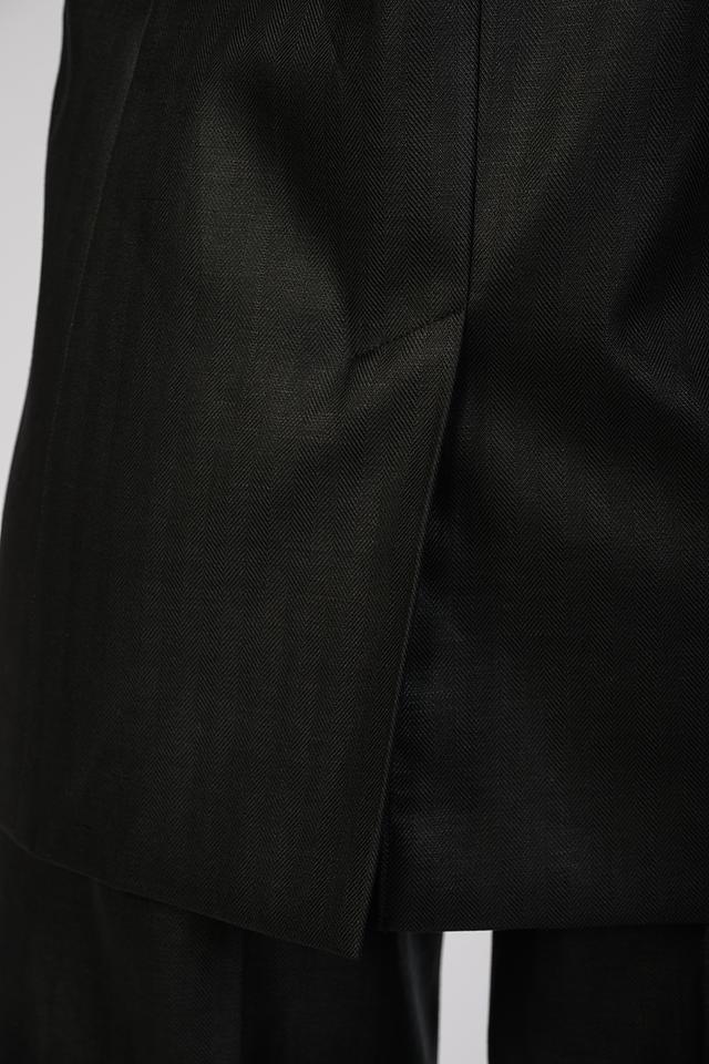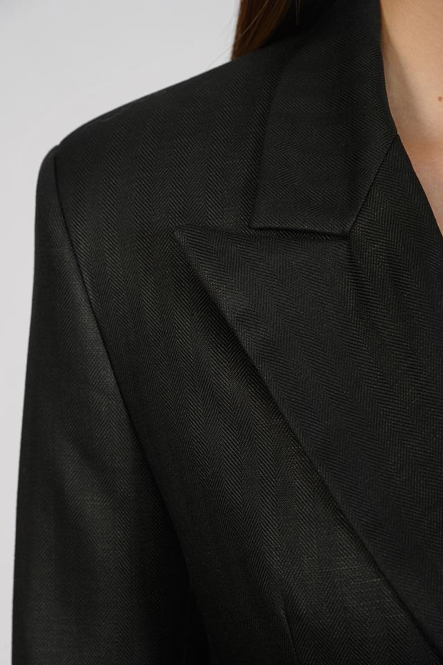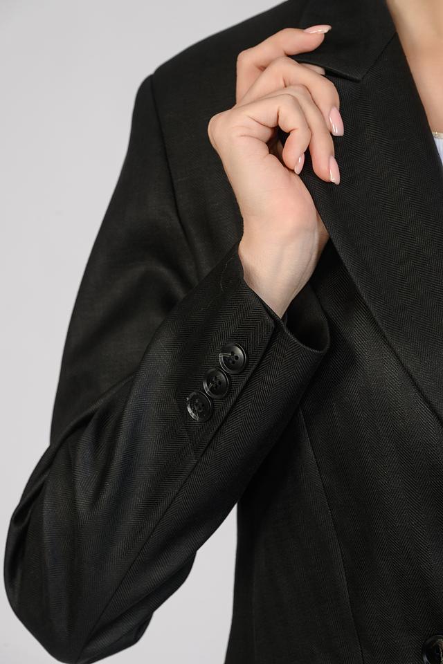 Жакет выполнен из высококачественной ткани с выраженной текстурой, напоминающей тонкую полоску. Это придает изделию благородный вид и делает его интересным акцентом в вашем стиле.