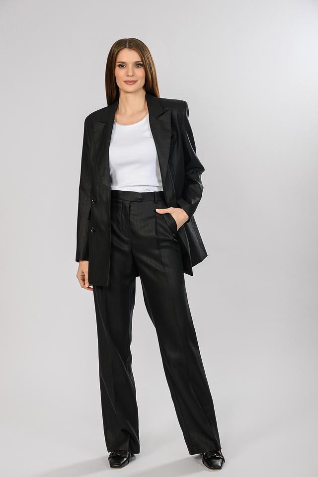 Дизайн брюк дополнен широким поясом с защипами, которые создают аккуратные складки и придают брюкам более изысканный вид. Боковые карманы обеспечивают функциональность и удобство. Данная модель станет отличным дополнением к вашему гардеробу и позволит создавать разнообразные образы — от деловых до повседневных.