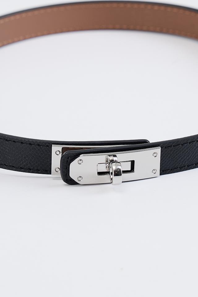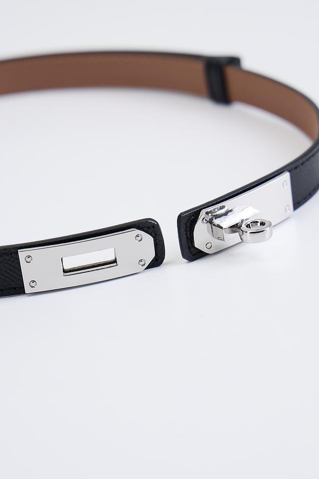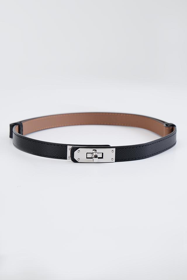 Ремень имеет классический чёрный цвет и лаконичный дизайн. Акцентным элементом является металлическая пряжка, которая придает аксессуару изысканность и современный вид. Внутренняя сторона ремня выполнена из коричневой кожи.