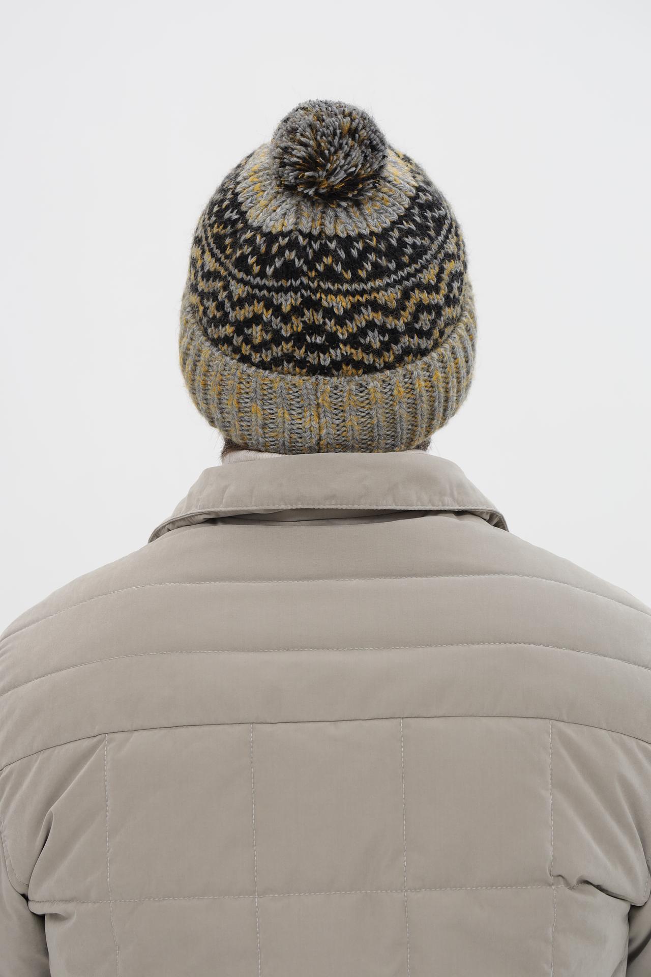 - Дизайн: Яркий геометрический узор и стильный помпон делают эту шапку эффектным аксессуаром.