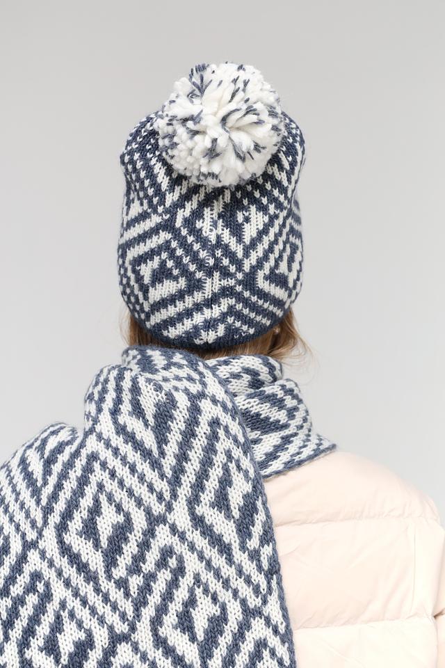 Стильная шапка Marhatter синего цвета с белым геометрическим узором и помпоном. Изготовлена из шерсти, акрила и альпаки для тепла и комфорта. Состав: шерсть 47%, акрил 45%, альпака 8%