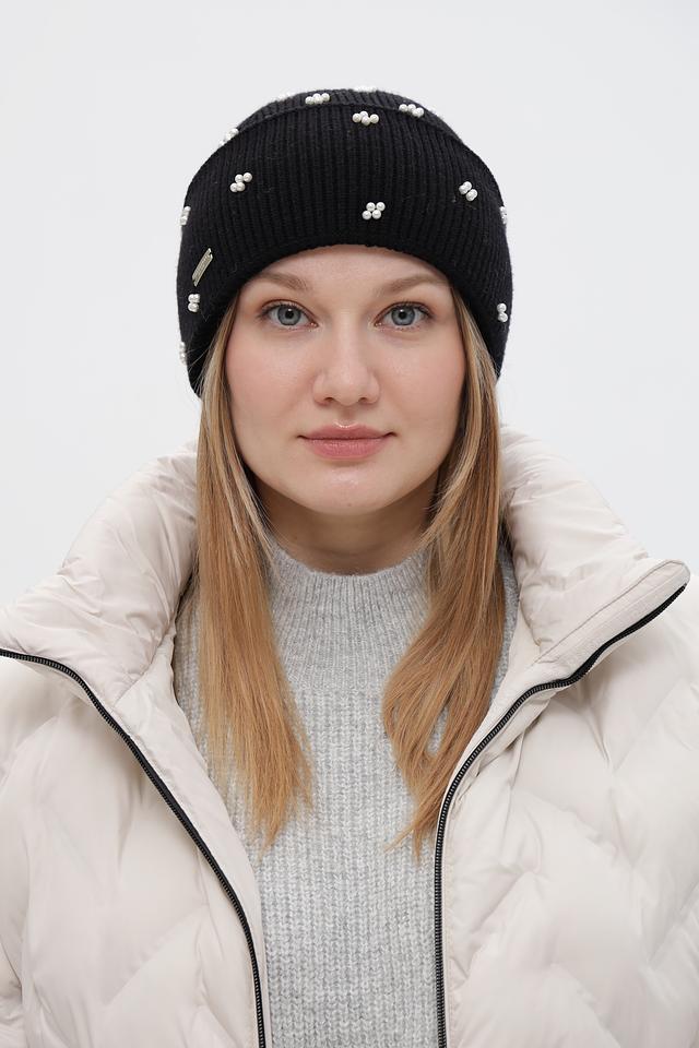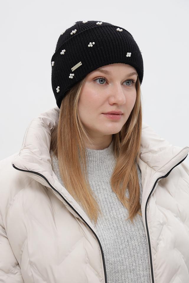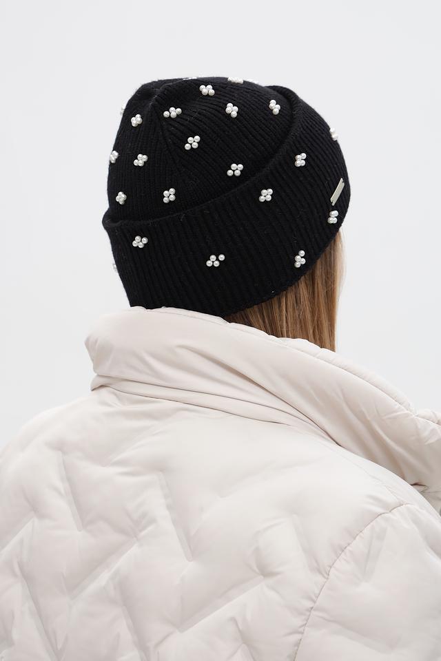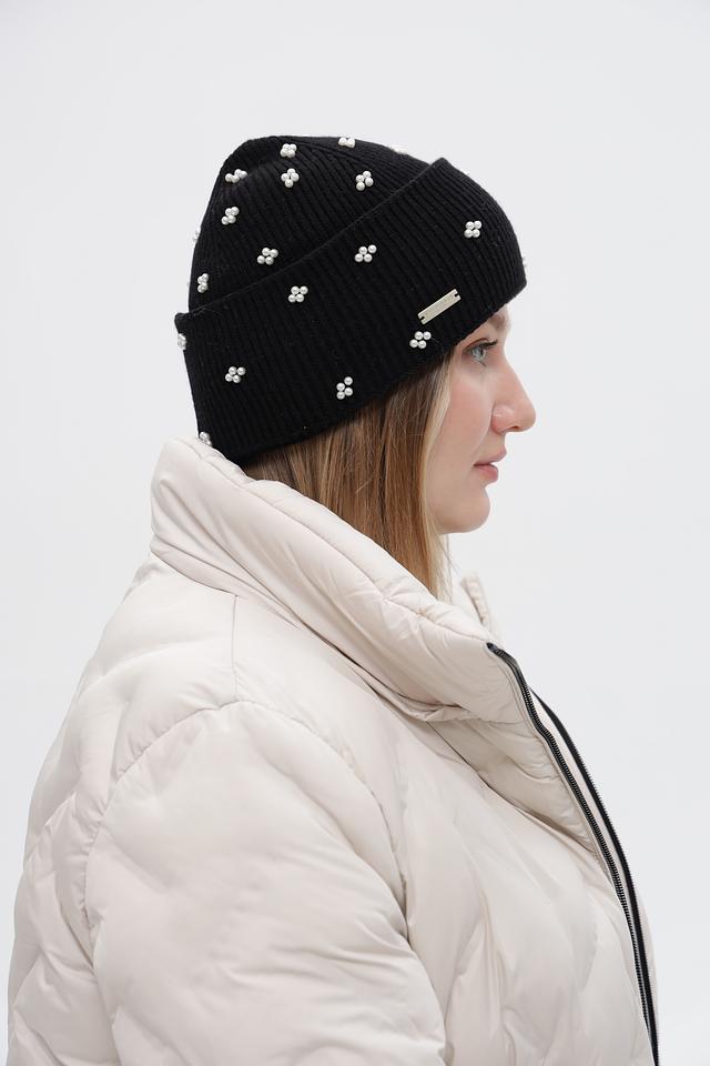 Основной цвет шапки — насыщенный черный. Особый шарм изделию придают аккуратно расположенные жемчужные бусины, создающие изясочный узор. Небольшой металлический логотип бренда расположен сбоку.