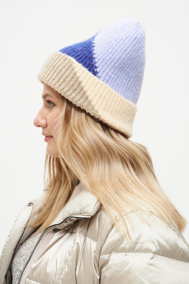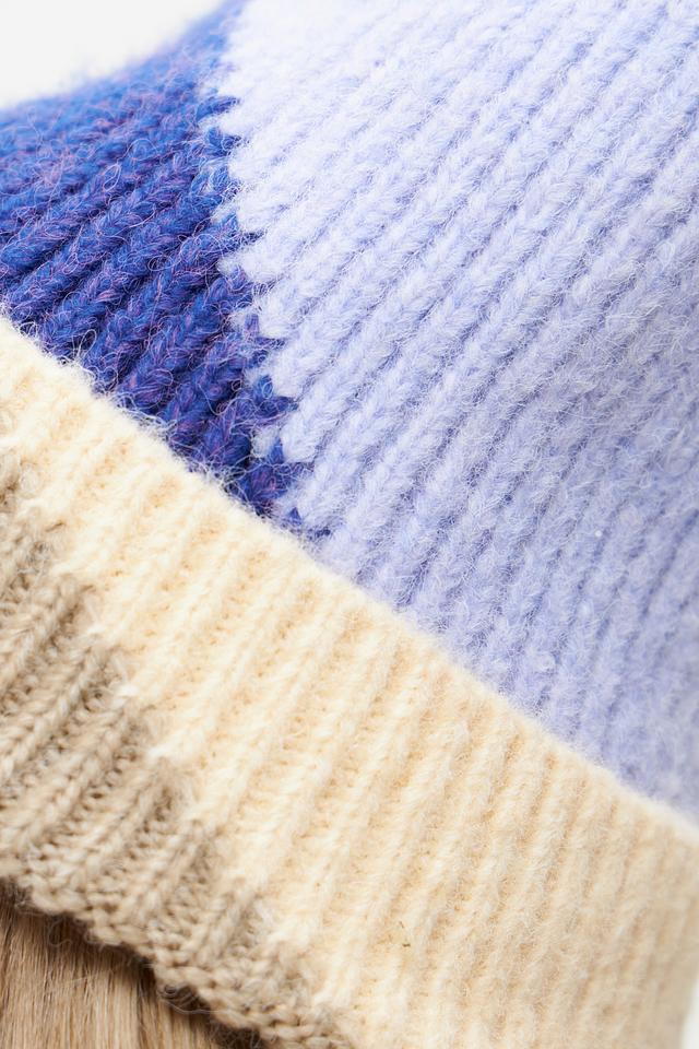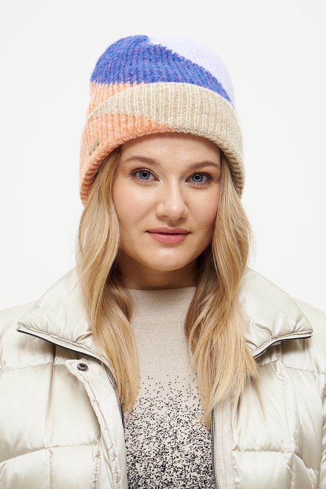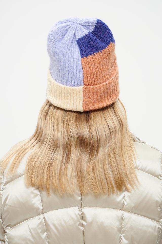 Дизайн шапки выполнен в виде цветовых блоков, сочетающих в себе оттенки голубого, лавандового, бежевого и оранжевого. Такое сочетание делает эту шапку универсальной и подходящей к различным стилям одежды.