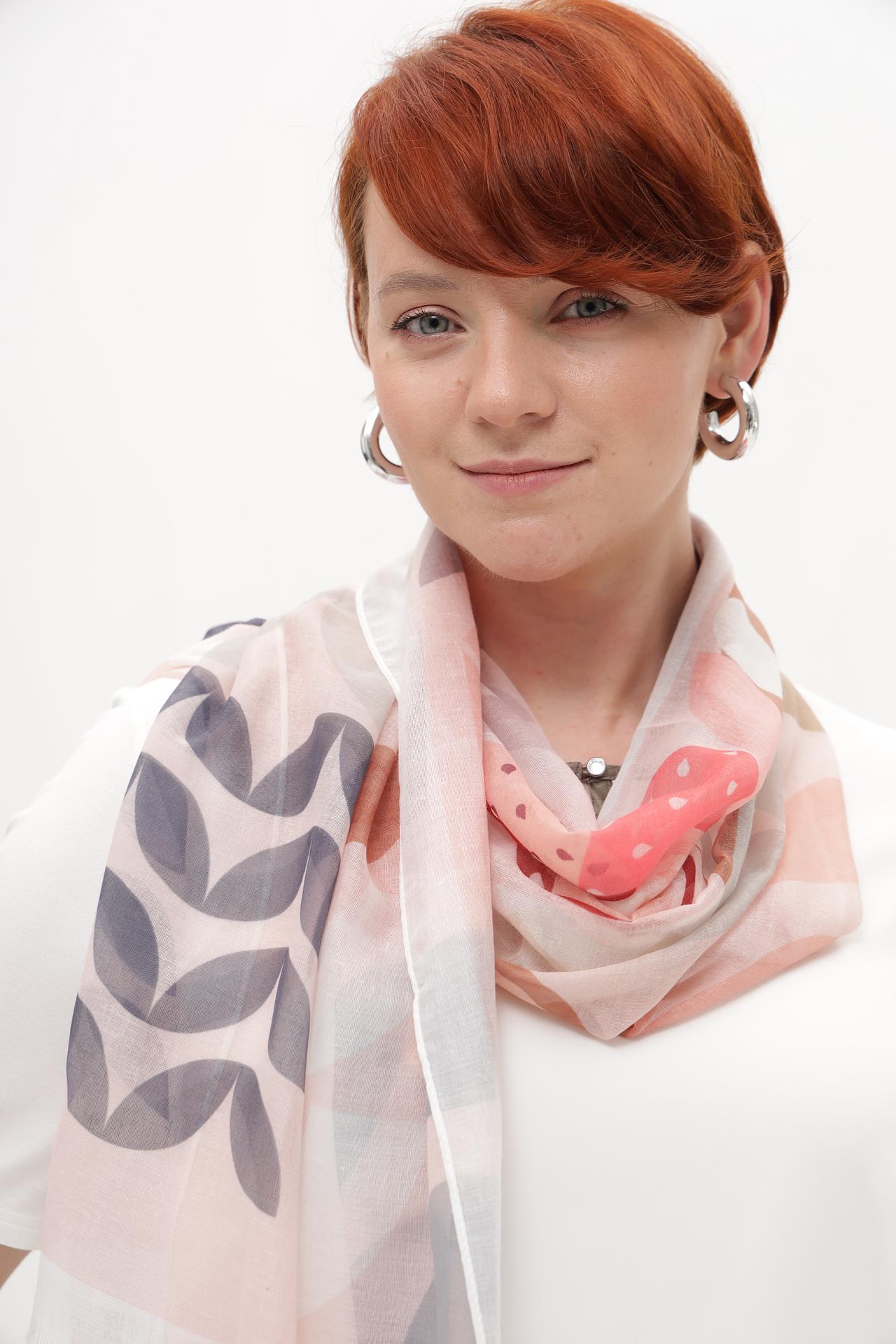 Нежный бежевый цвет с принтом из листьев делает шарф универсальным аксессуаром, который легко сочетается с различной одеждой. Мягкая текстура материала приятна к телу, а легкость в уходе порадует даже самых требовательных покупателей.