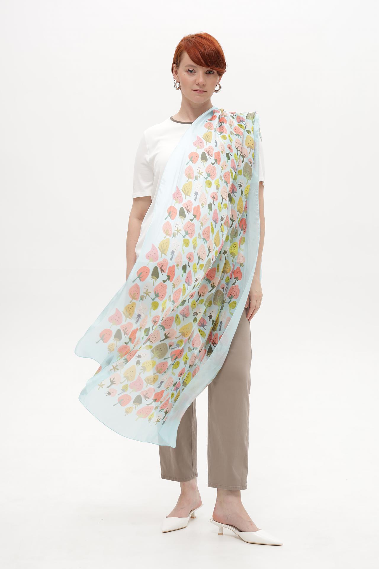 - Цвет: Нежный голубой фон с красочным рисунком делает шарф универсальным аксессуаром.