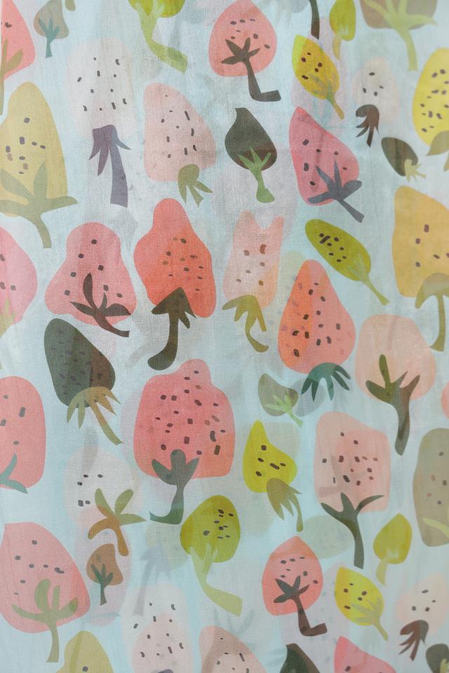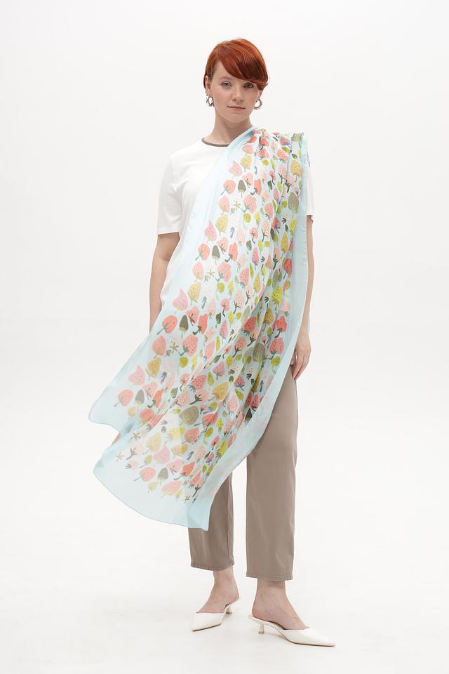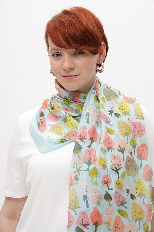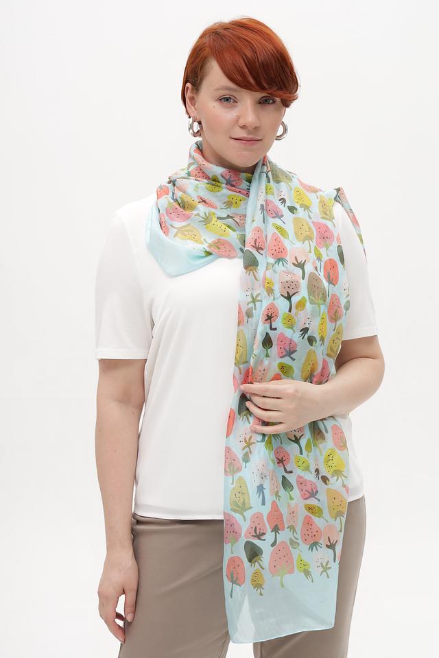 Изделие имеет прямоугольную форму и украшено ярким принтом, изображающим разноцветные листья и растения на голубом фоне. Принт выполнен в акварельной технике, что придает шарфу легкость и воздушность.