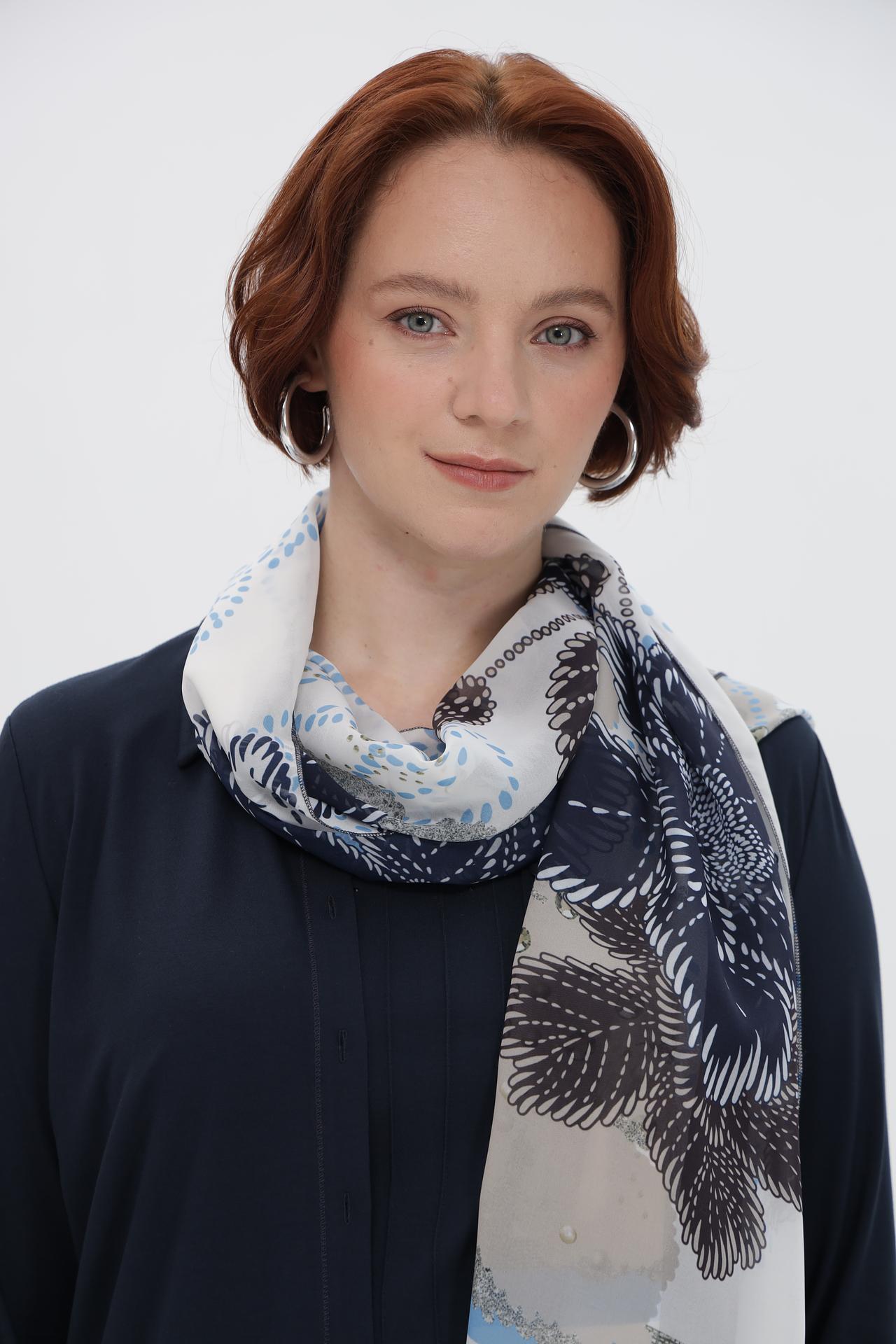 - Дизайн: Современный абстрактный принт в серо-синих тонах с мерцающими бусинами. Яркий акцент, который преобразит любой наряд.