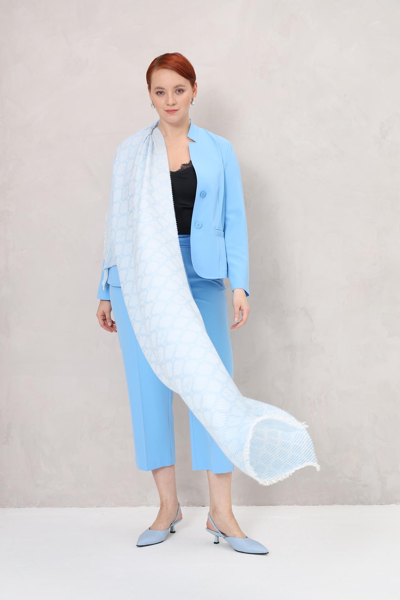 - Элегантный дизайн: Нежный небесно-голубой цвет и рельефная текстура придают шарфу особую изысканность.