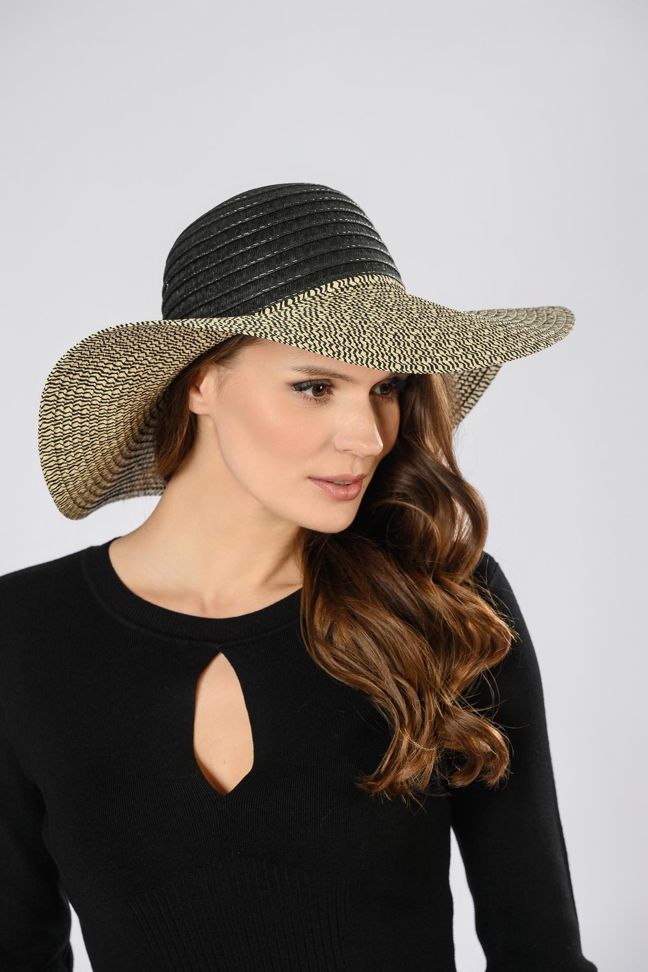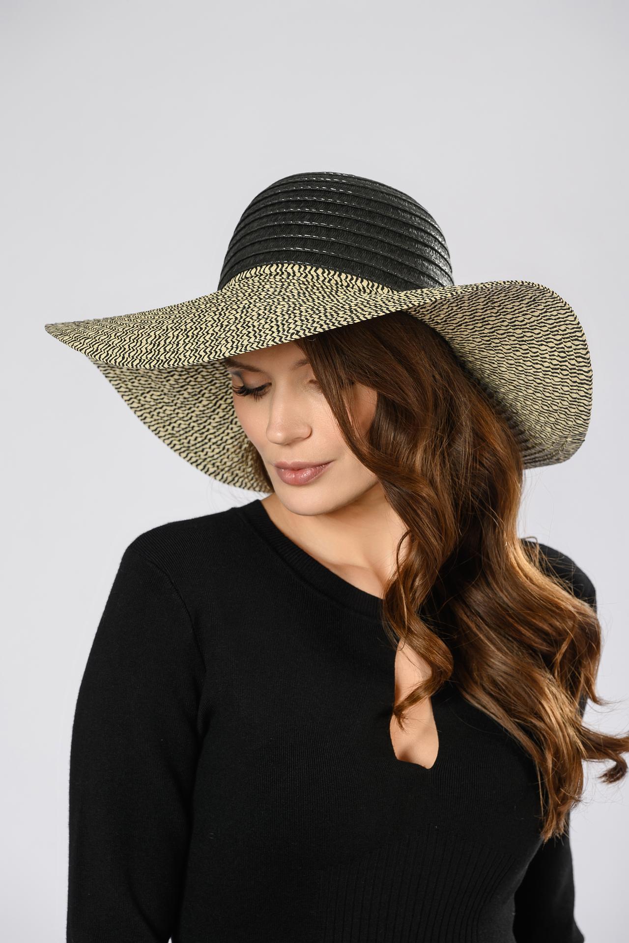 - Дизайн: Классическая форма с широкими полями и комбинированной расцветкой. Верхняя часть выполнена в чёрном цвете, а поля украшены узором в мелкую крапинку бежевого оттенка.