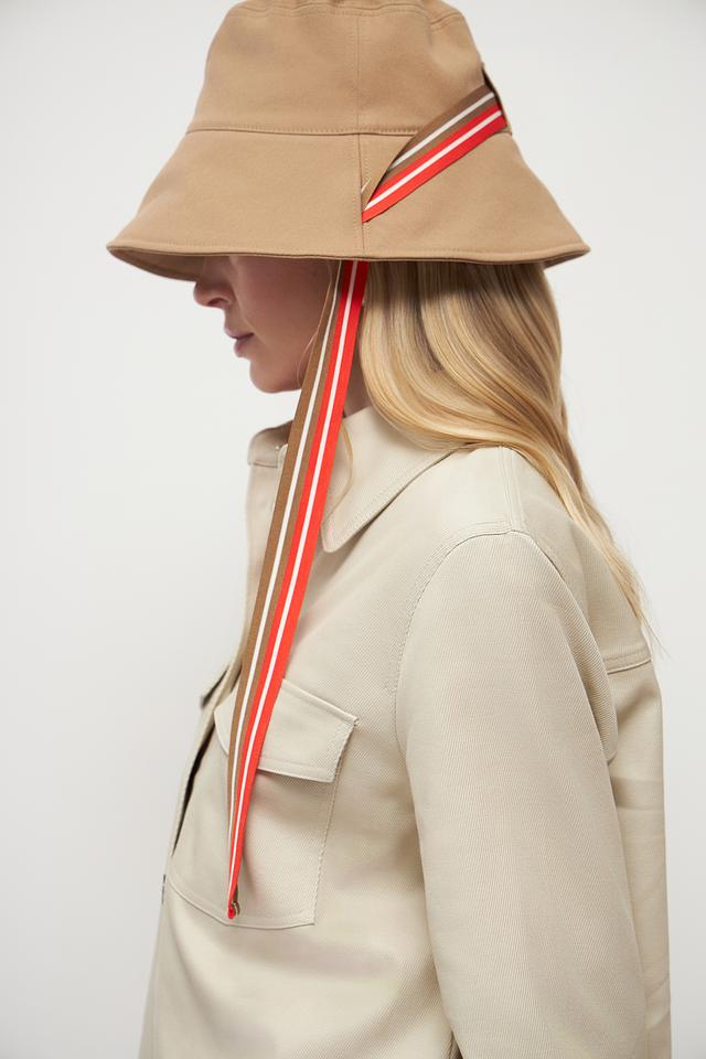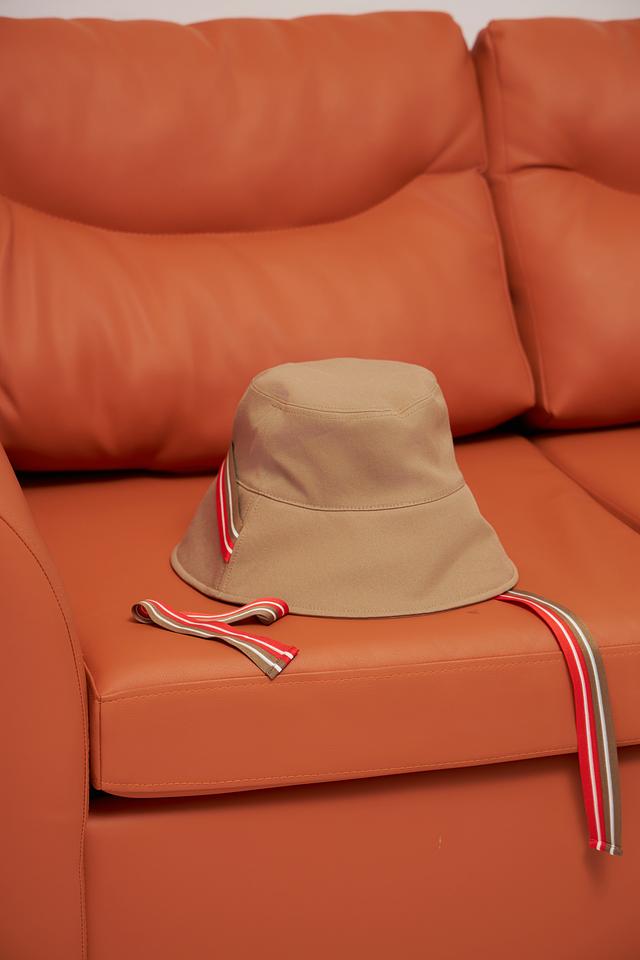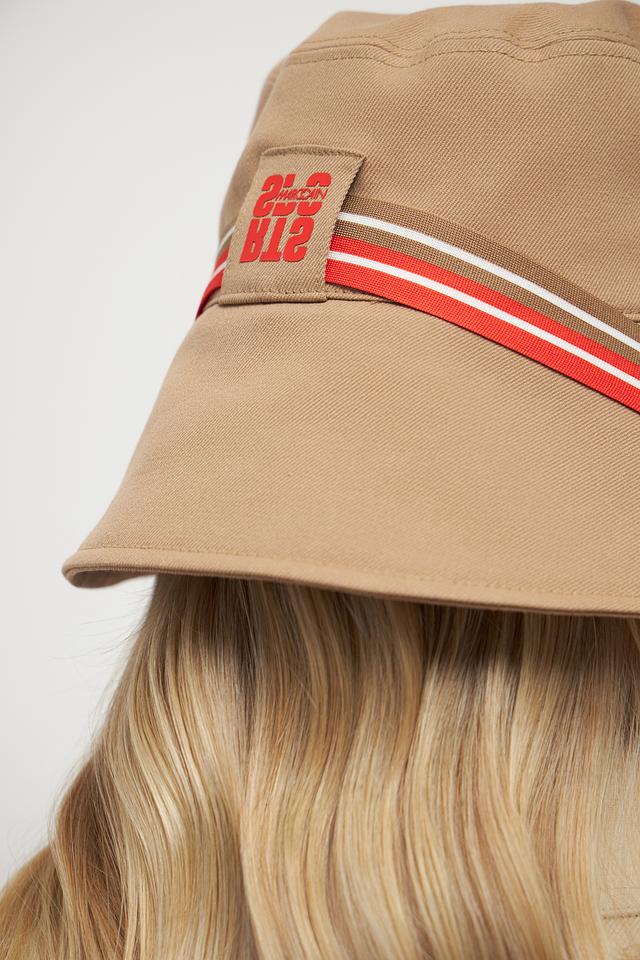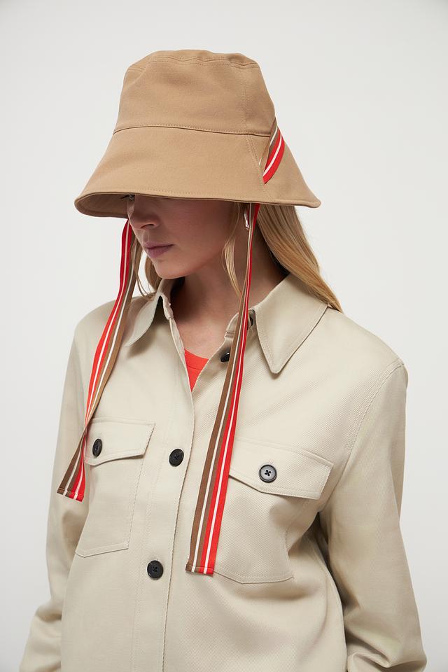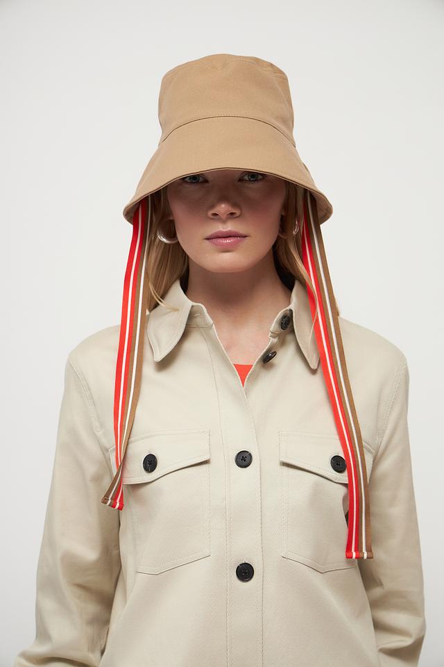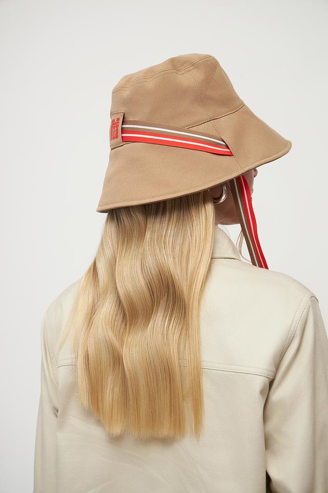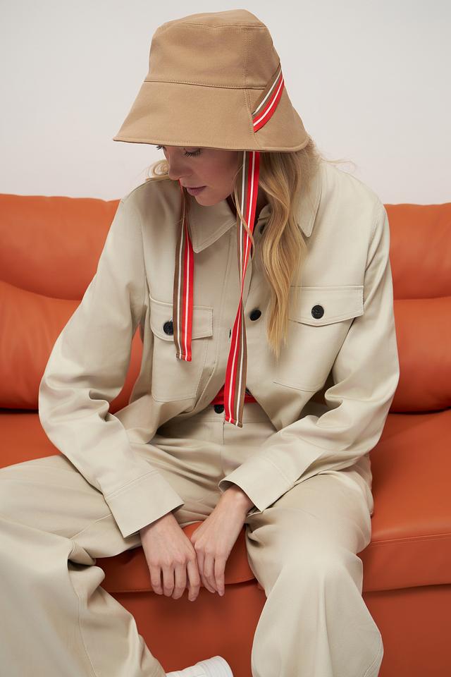 Шляпа имеет классическую форму и нейтральный бежевый цвет, который легко сочетается с различными нарядами. Декоративные ленты с красными и белыми полосами добавляют образу оригинальности и динамики.