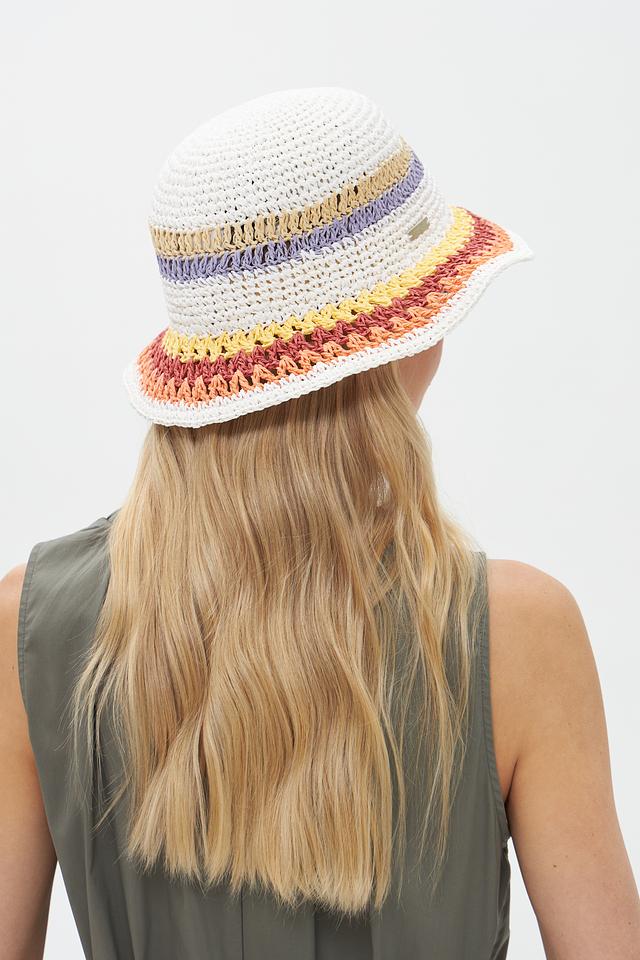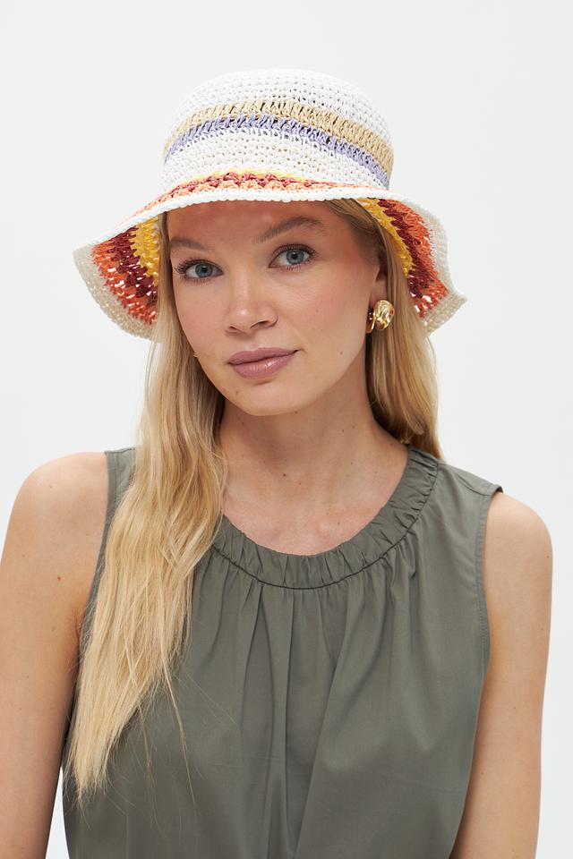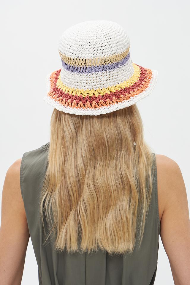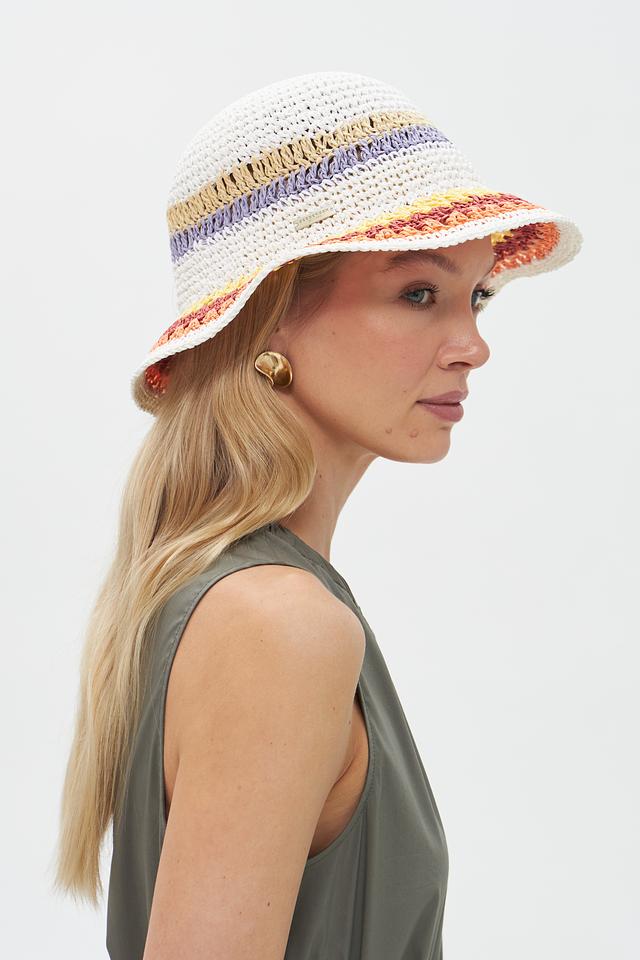 Шляпа имеет широкие поля, обеспечивающие надежную защиту от солнечных лучей. Разноцветная полосатая отделка придает изделию оригинальность и привлекательность.