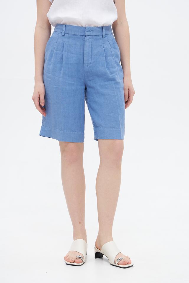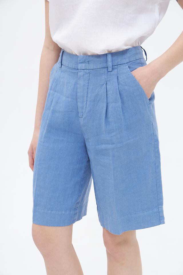 Женские шорты Oui голубого цвета, выполнены из 100% льна. Модель прямого кроя с завышенной талией и складками для создания свободного силуэта. Идеальный выбор для комфортного летнего образа. Состав: лен 100%