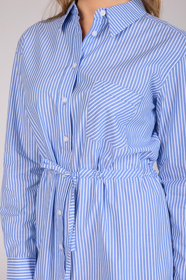Блуза застёгивается на пуговицы по всей длине. Талию акцентирует съёмный пояс, который позволяет регулировать силуэт и создавать более женственный образ.