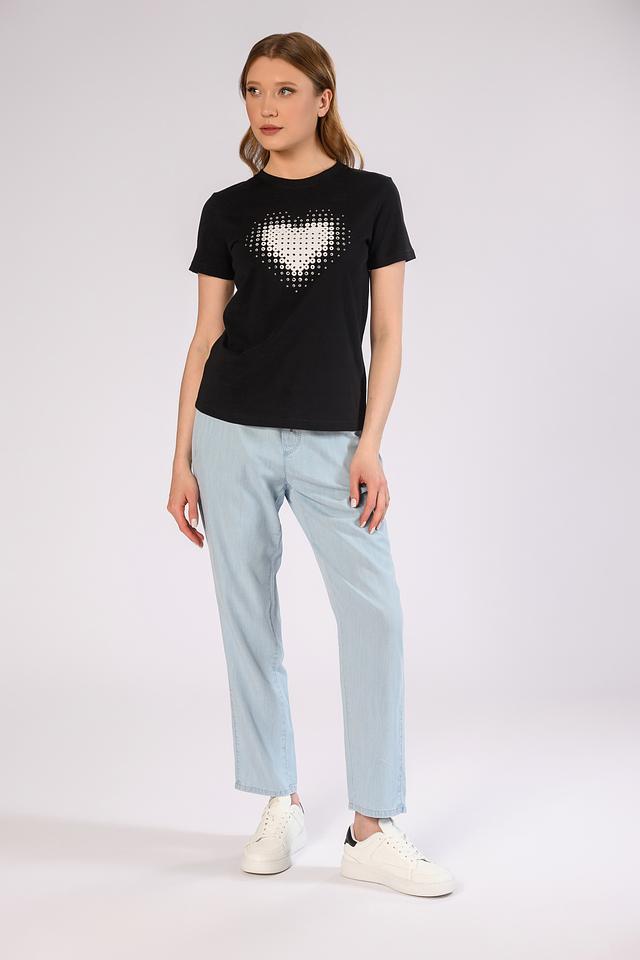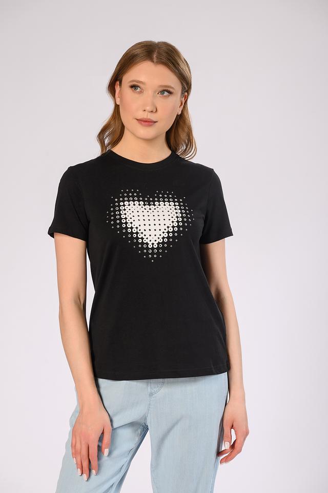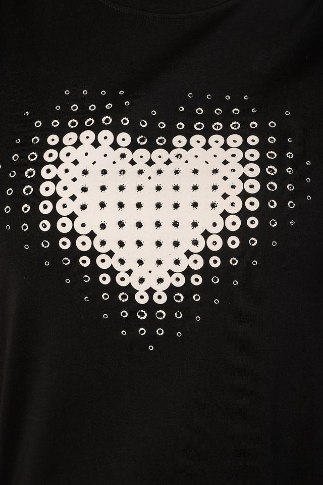 Основным акцентом футболки является оригинальный принт в виде сердца, выполненный в виде множества белых точек. Этот декор придает образу изюминку и делает его запоминающимся.