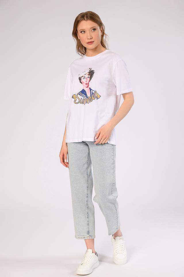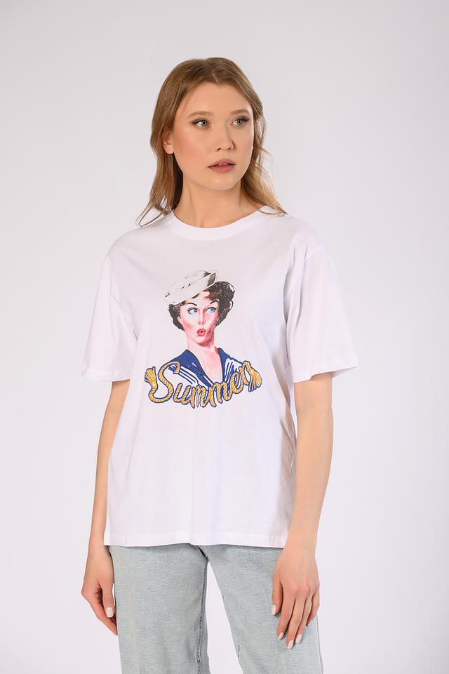 Особенности дизайна: футболка украшена крупным, детализированным принтом в стиле ретро, изображающим девушку в морской тематике. Принт выполнен в ярких цветах, что делает футболку запоминающейся и привлекательной.