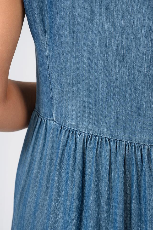 Модель отличается воротником рубашечного типа и застежкой на пуговицы по всей длине переда. Многослойная юбка придает платью лёгкость и воздушность. Платье не имеет рукавов, что делает его идеальным выбором для теплой погоды.