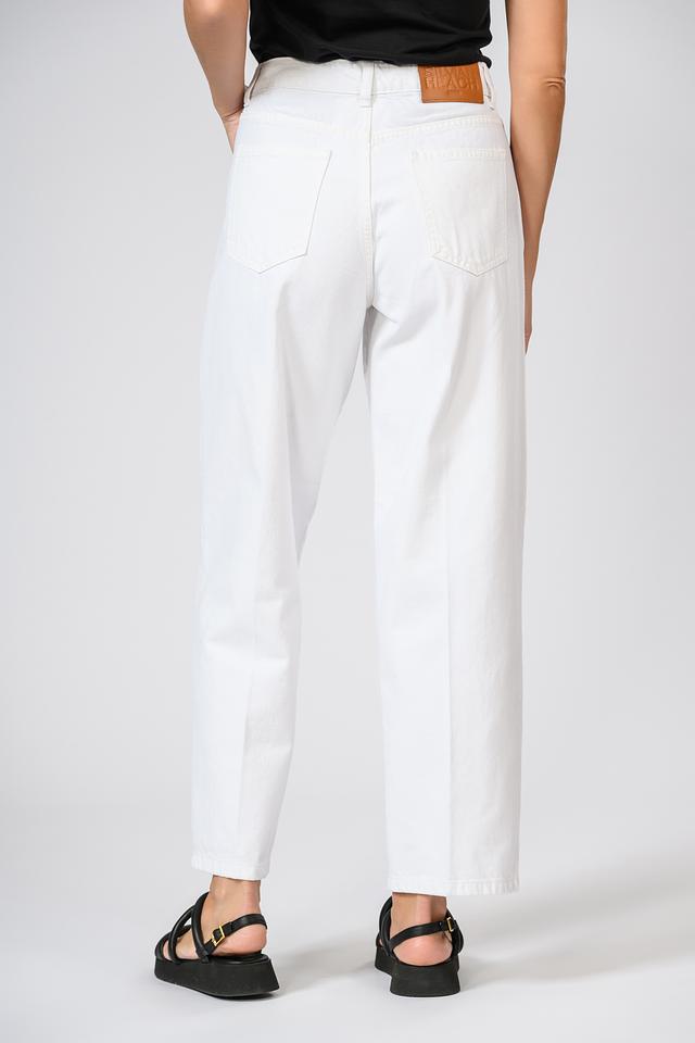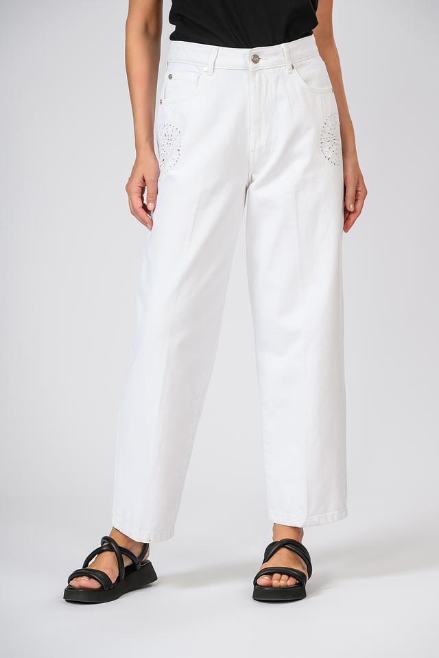 Брюки имеют классический крой с высокой посадкой и широкими штанинами, что обеспечивает комфортную посадку и свободу движений. Декоративная вышивка на карманах добавляет им оригинальности и стиля.