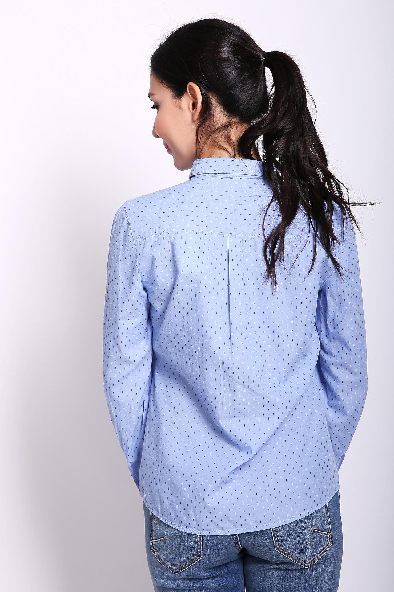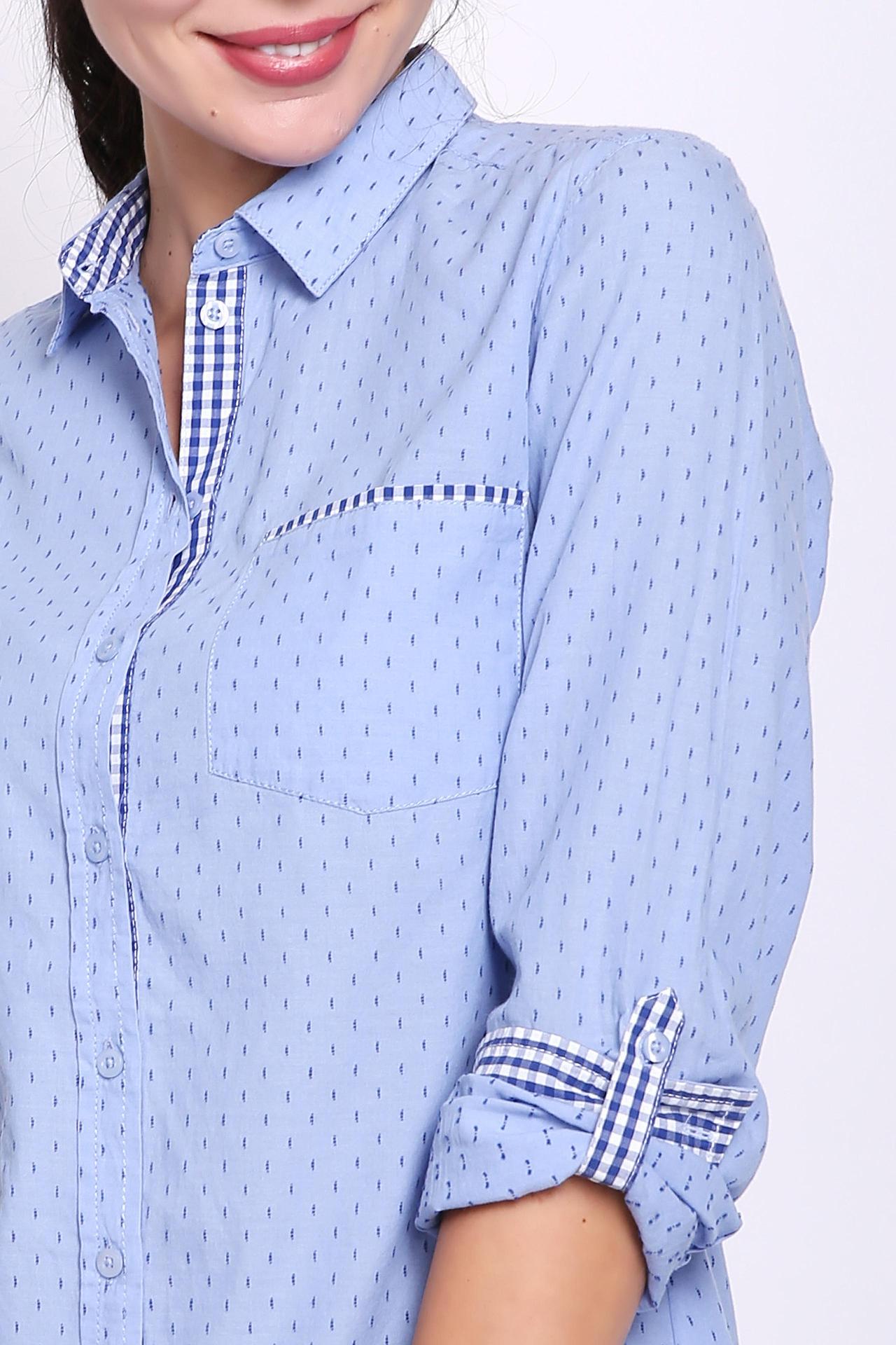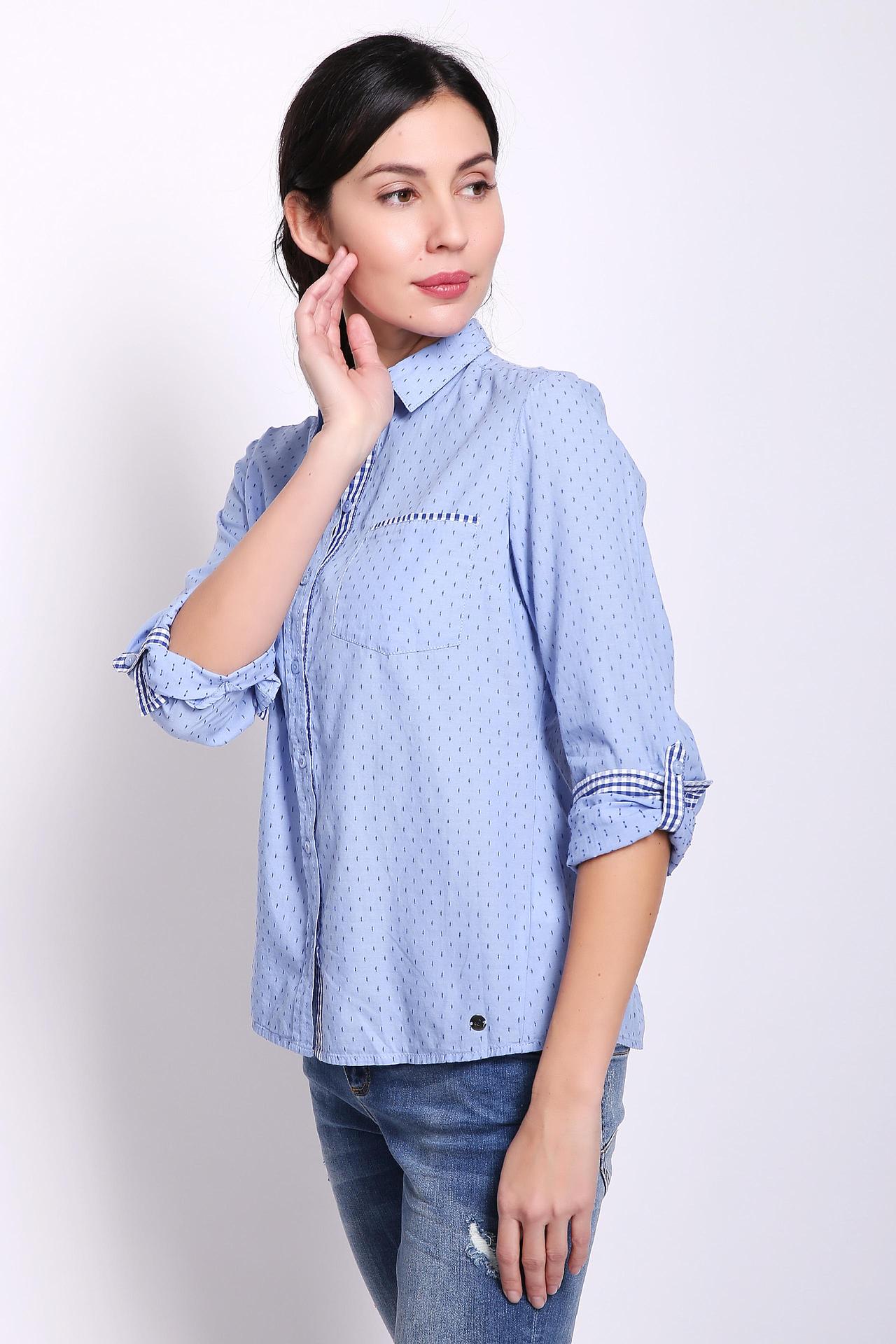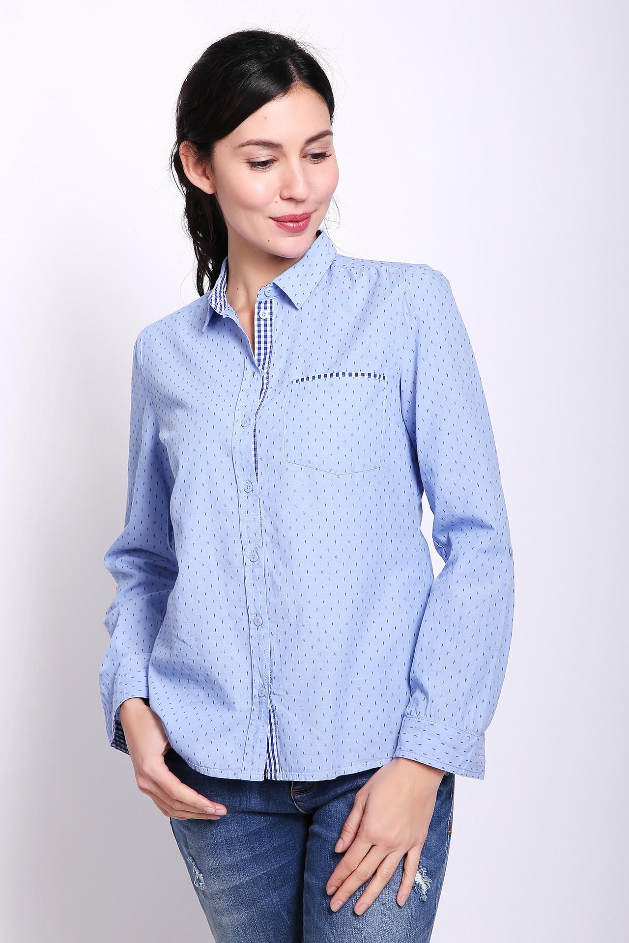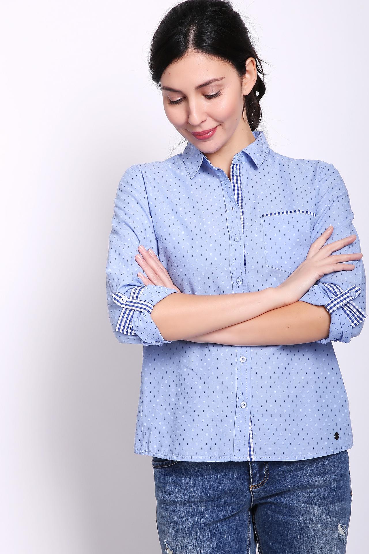 Блуза женская голубого цвета от бренда s. Oliver. Модель выполнена прямым фасоном. Изделие дополнено округлым воротом на стойке, втачными, длинными рукавами с манжетами на пуговицу, застежка на пуговицы, накладным карманом, задней кокеткой. Длина рукавов фиксируется тесьмой на пуговицу. Ткань имеет принт. Состав ткани: 100% хлопок. Сочетать можно с различными брюками.