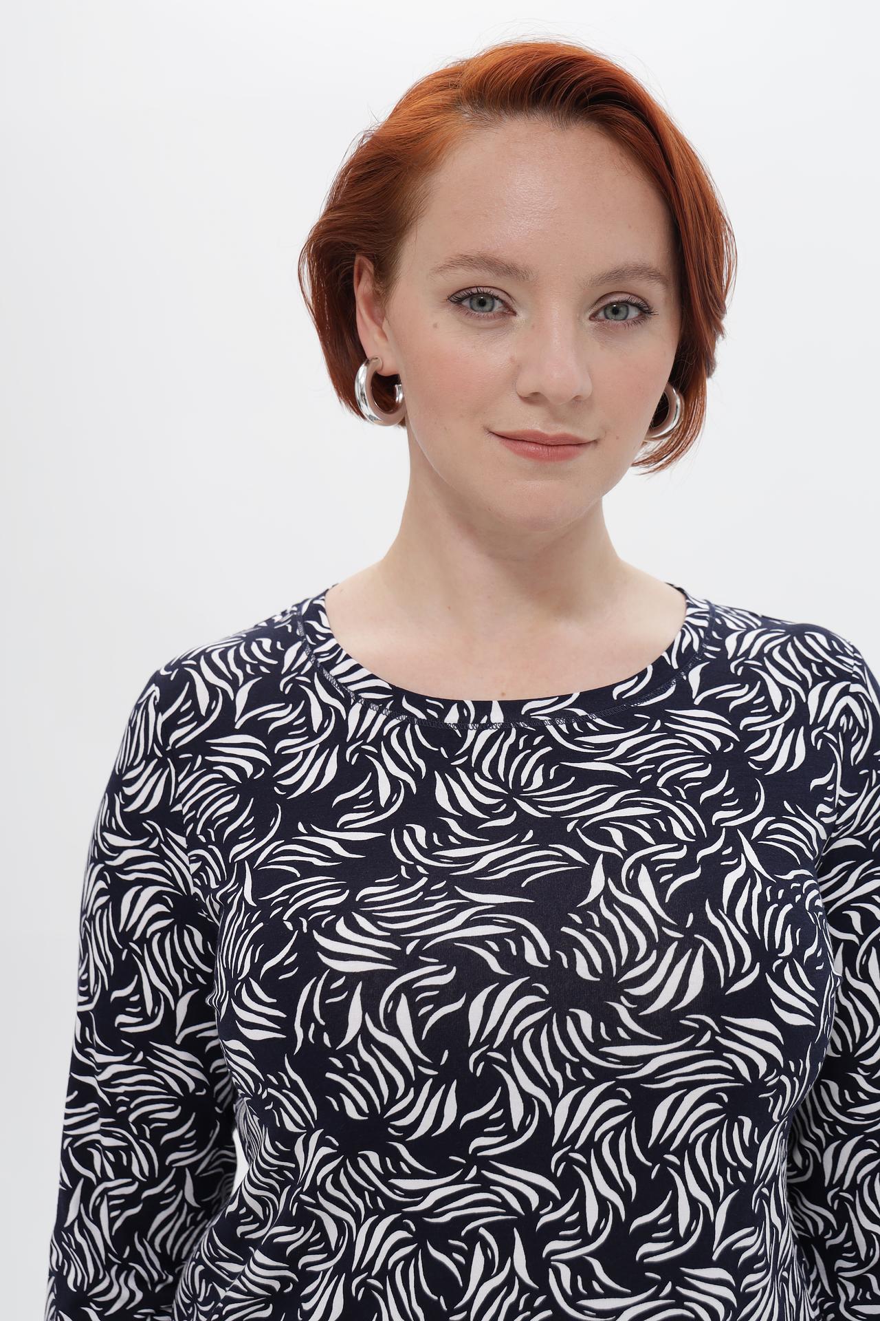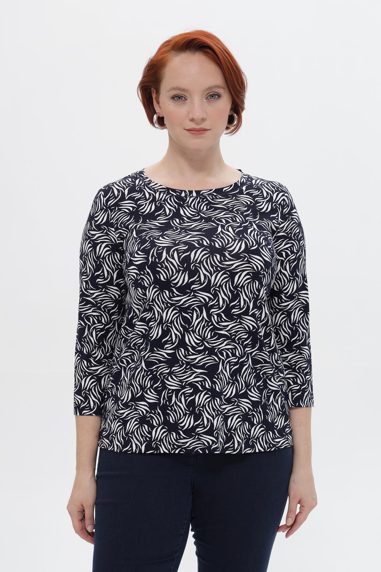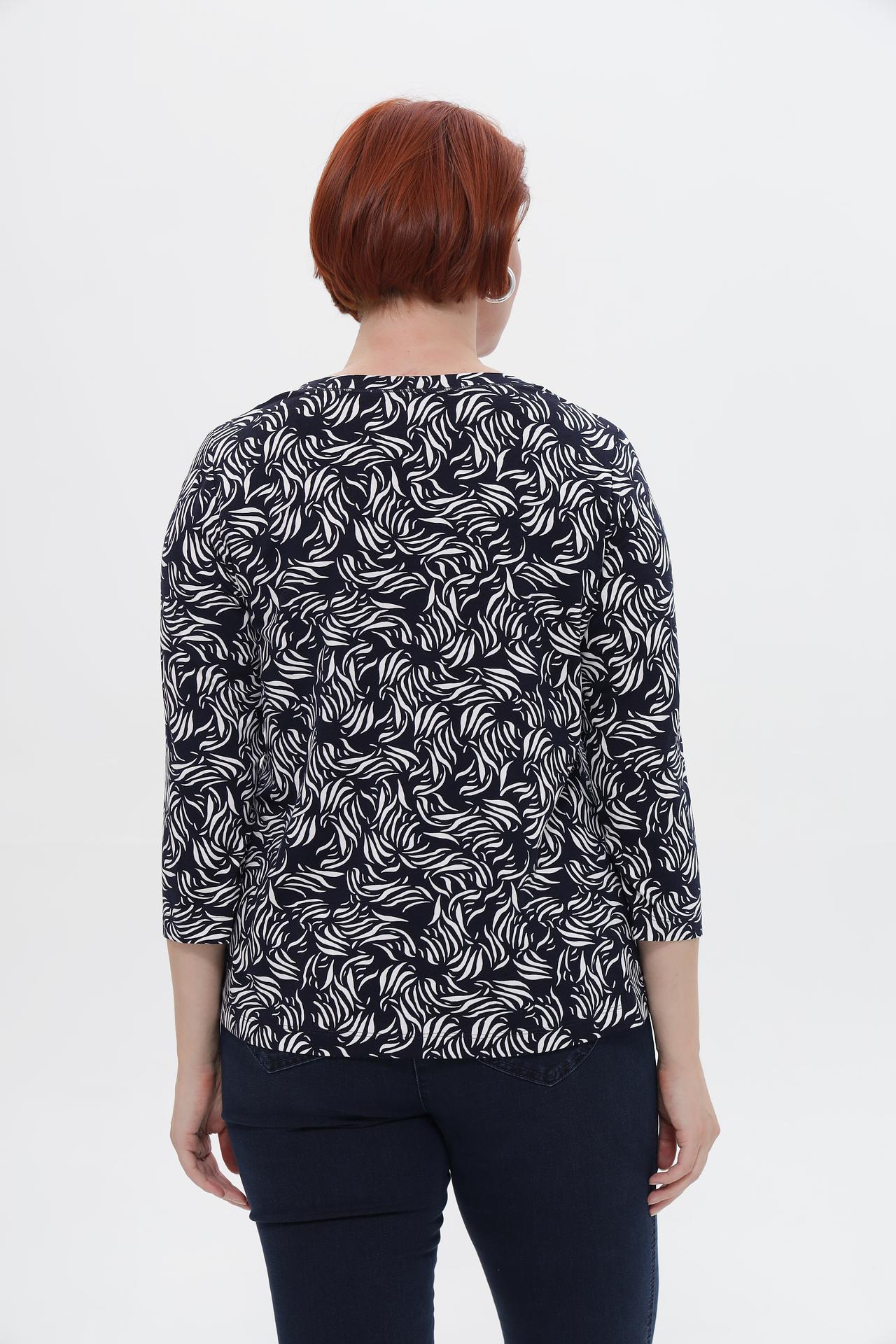 - Принт: Оригинальный темно-синий принт с белыми элементами. Этот узор придает блузе динамичность и привлекательность, делая ее ярким акцентом вашего наряда.