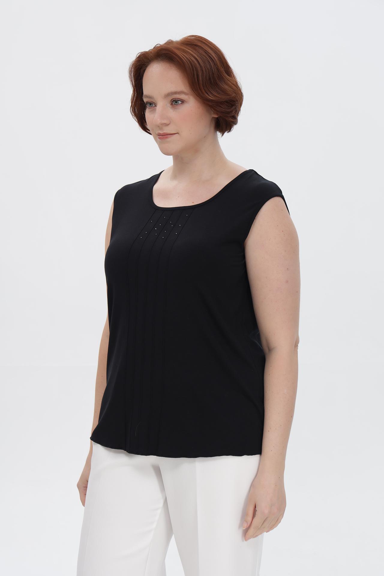- Дизайн: Классический крой с округлым вырезом и отсутствием рукавов делает топ универсальным элементом гардероба. Вертикальные защипы и россыпь страз на лифе придают модели особую привлекательность.
