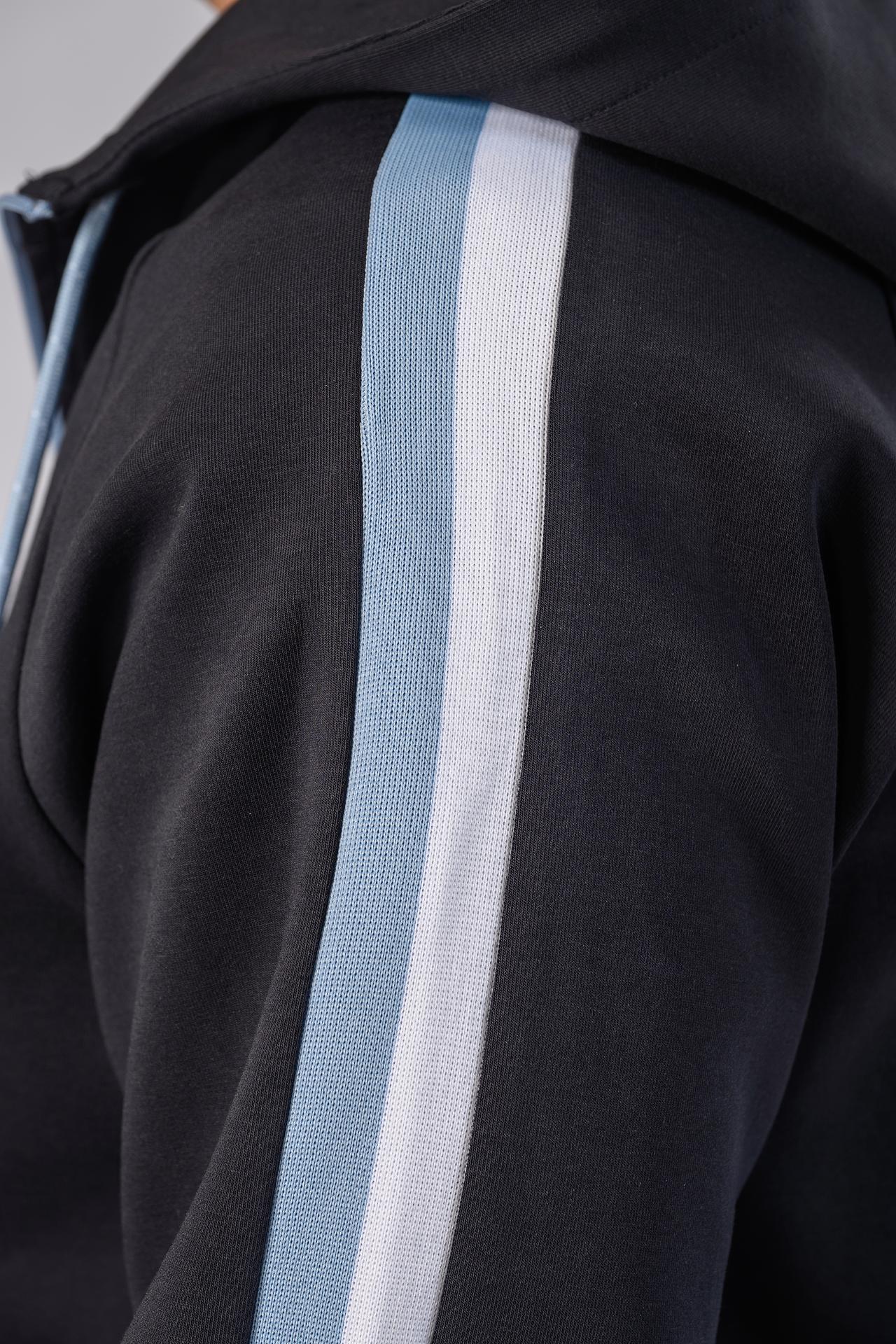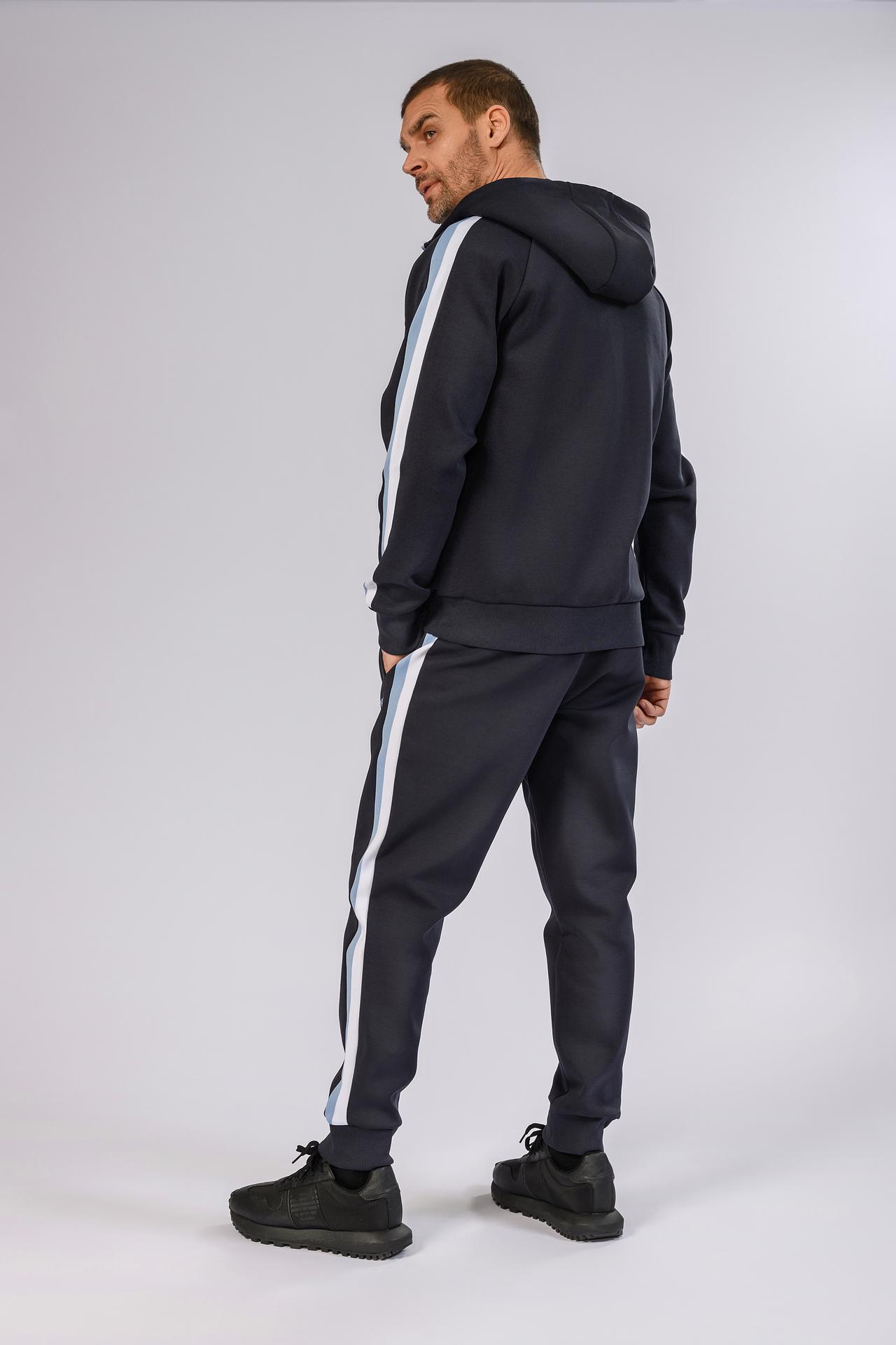 Мужской спортивный костюм отличается элегантным дизайном и превосходным качеством пошива. Тёмно-синий цвет костюма — универсальное решение для любого стиля. Контрастные полосы по бокам брюк и рукавов добавляют динамичности и спортивного шика.