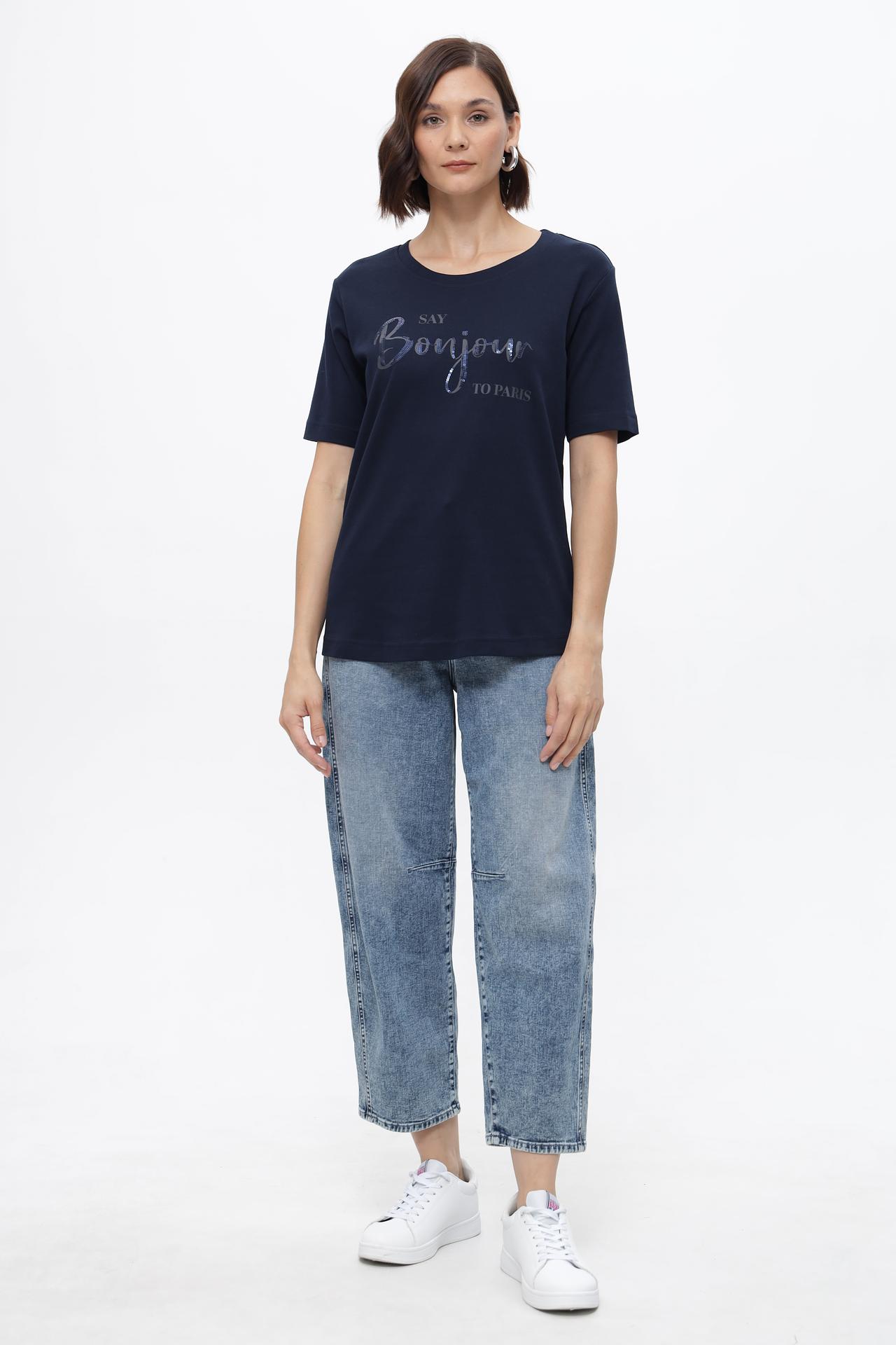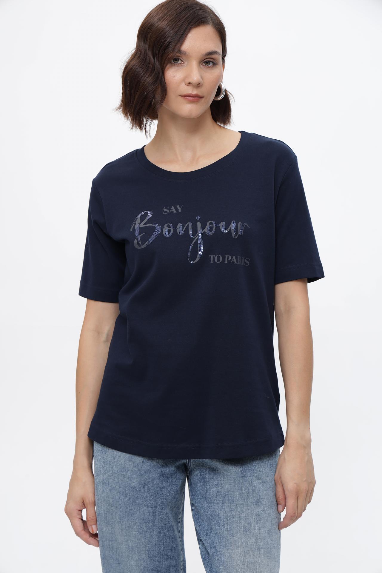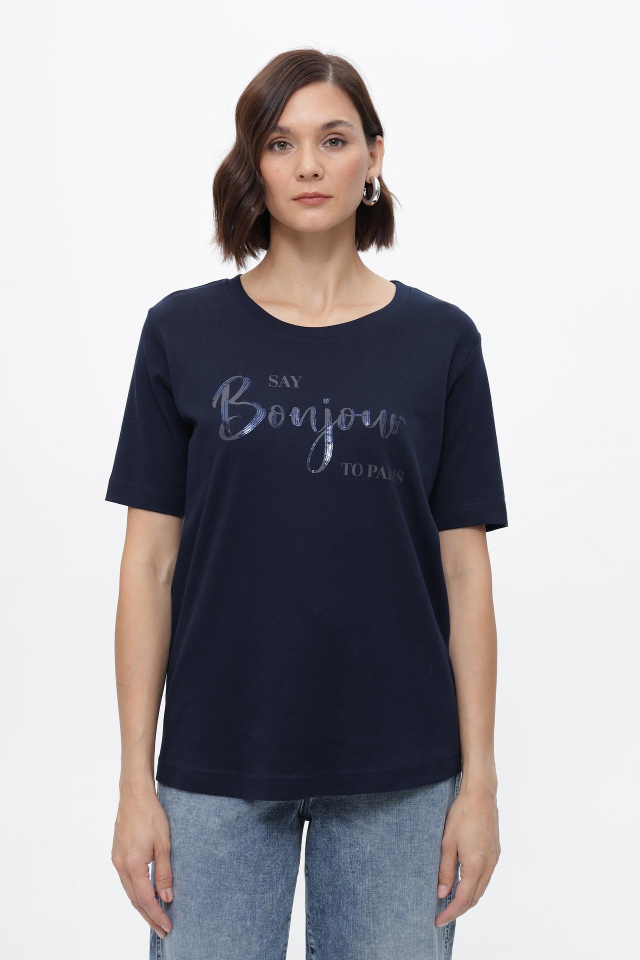 Футболка Steilmann из 100% хлопка — идеальный выбор для создания стильных и комфортных образов. Классический темно-синий цвет и лаконичный дизайн делают ее универсальной основой для вашего гардероба. Привлекательный принт с надписью "Say Bonjour to Paris" добавляет изюминку и подчеркивает ваш утонченный вкус.