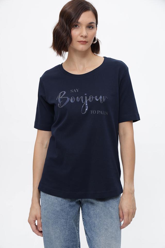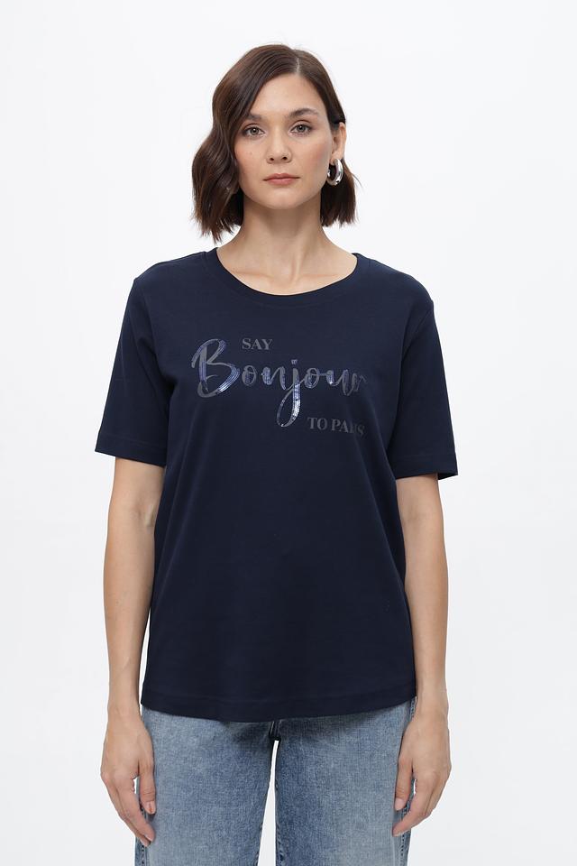 Синяя футболка Steilmann из 100% хлопка с эффектным принтом "Bonjour to Paris". Базовый крой и натуральный состав обеспечивают комфорт в повседневной носке. Состав: хлопок 100%